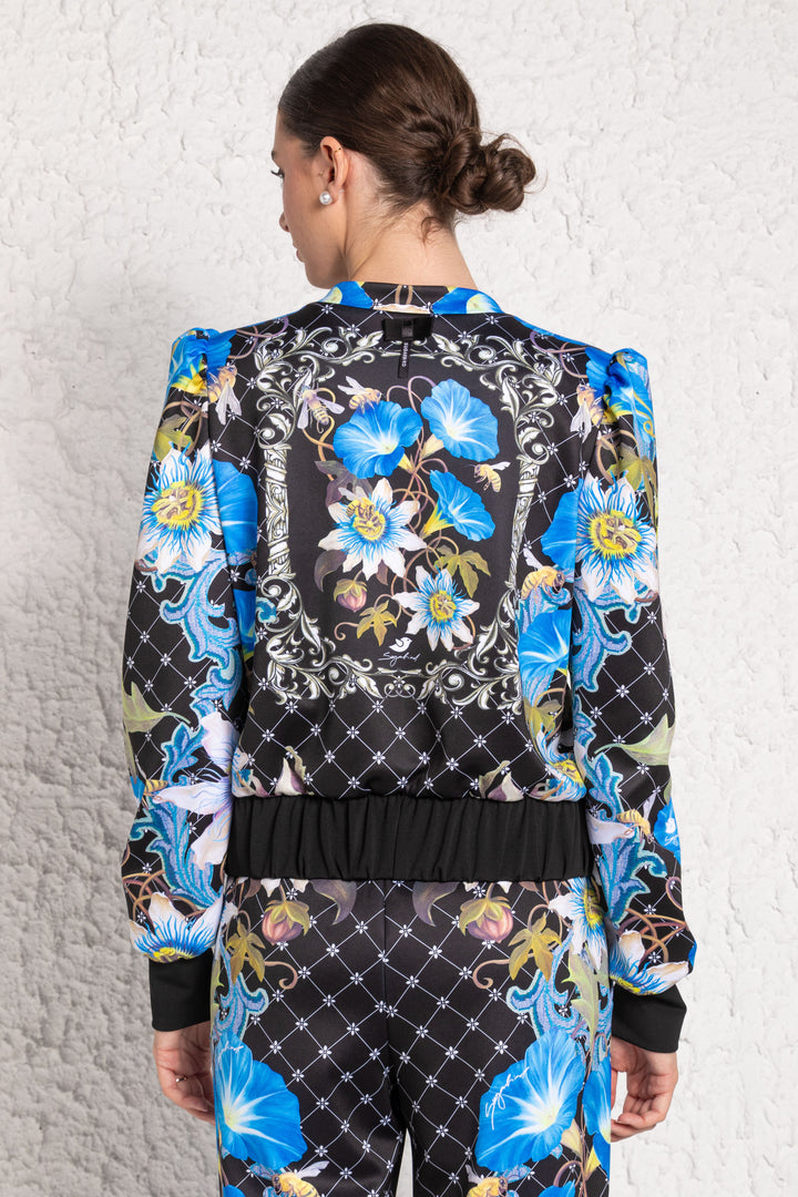 Long-sleeved, straight-cut jacket that reaches below the waist. The round neck is finished with a tailored collar. The waistband is elasticated and the front opens with a zip in the middle. On the back SUGARBIRD We decorated it with a label and bow accessories.