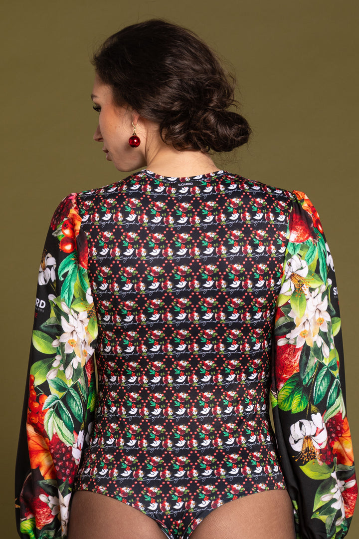 Long and puffy sleeve, form-fitting bodysuit. Elasticated thigh bottom with adjustable snap closure. Closed and round neck with narrow strap. Back