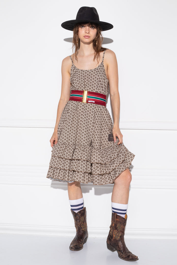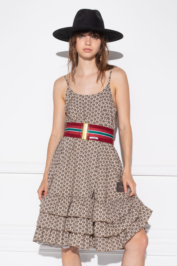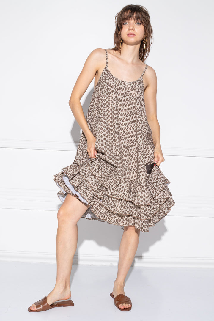 Knee-length, A-line, loose, loose-fitting dress. Curved neckline at the front and back. Narrow shoulder straps are adjustable. Multi-row, rich ruffles at the bottom, front SUGARDecorated with a label with the inscription BIRD.