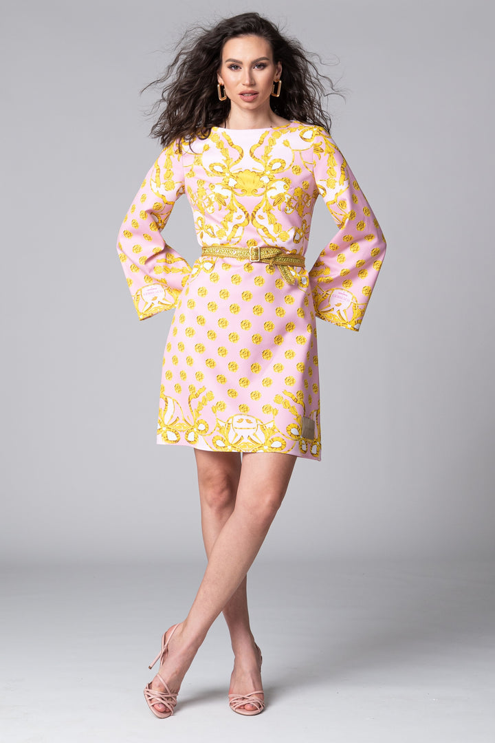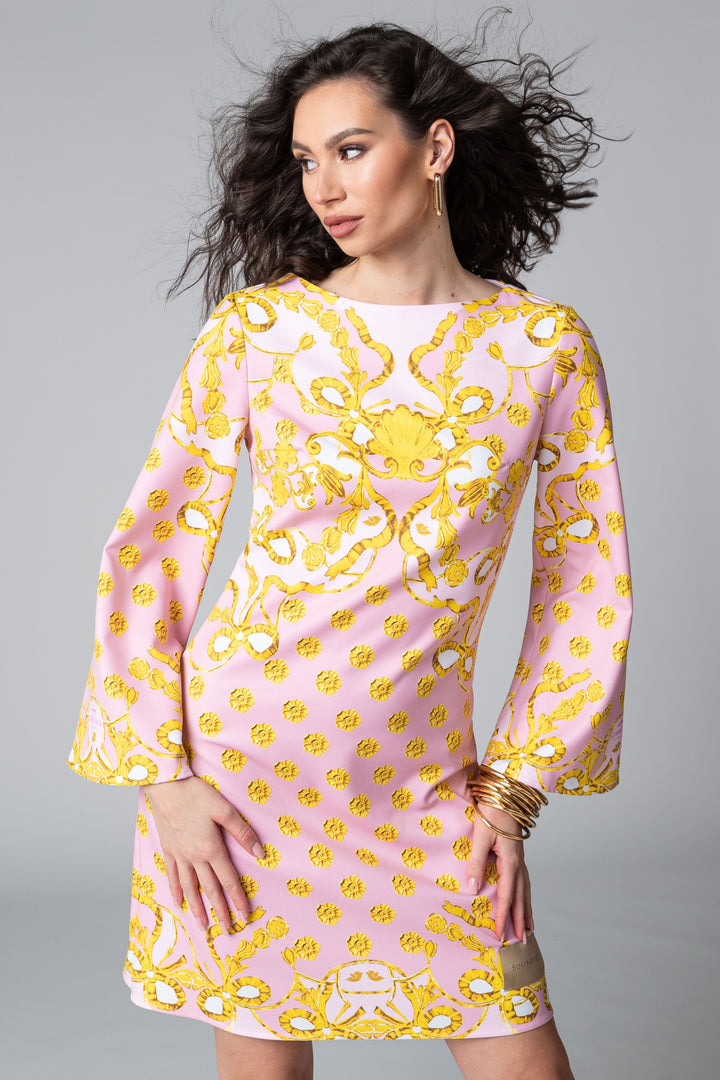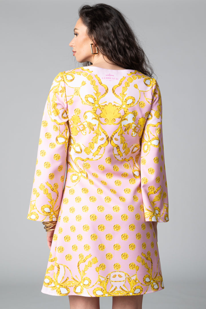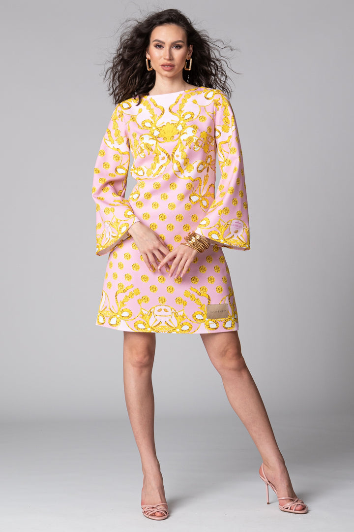 Long, bell-sleeved, above-the-knee, loosely fitted, lined dress. Boat neckline. Zipper on the left side. Front SUGARBIRD decorated with a label.