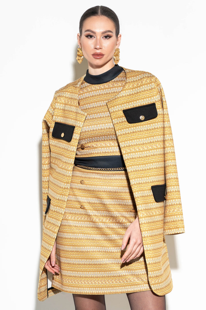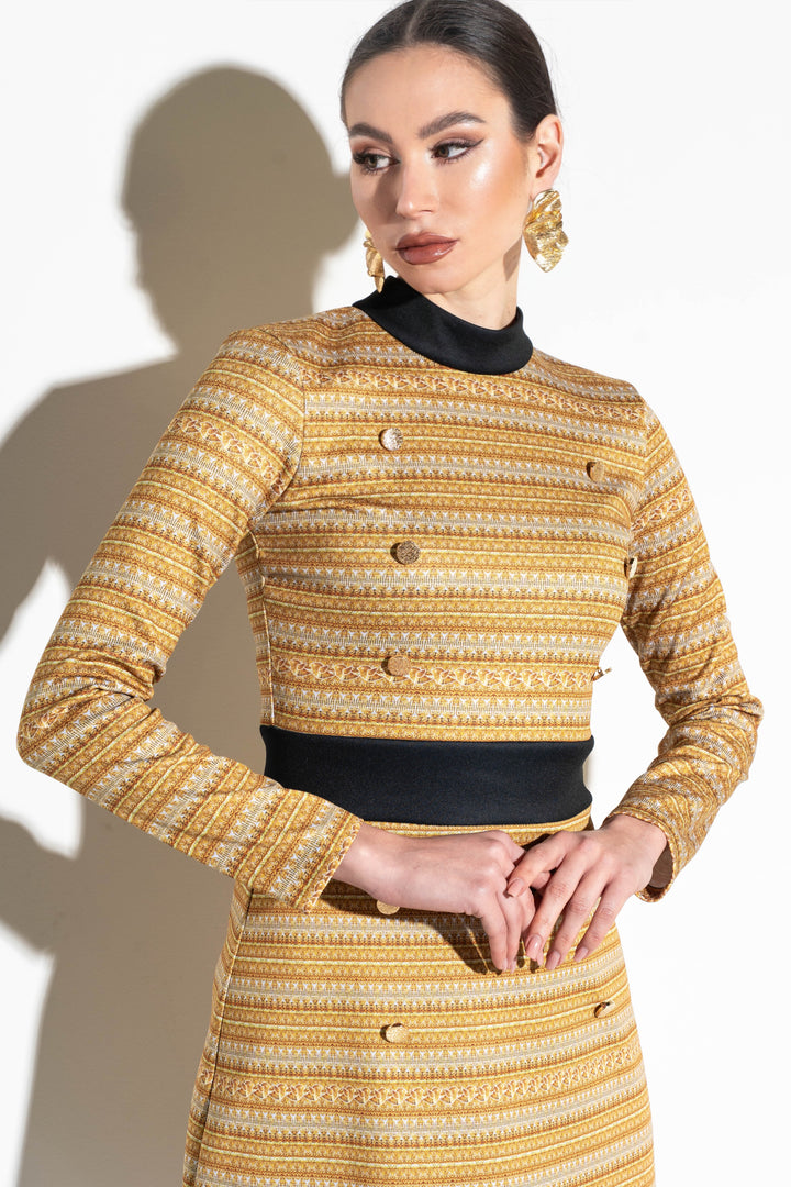 Fedezd fel Gold kollekciónk világát, amely az ünnepi csillogás varázsát és időtlen szabadságát ötvözi. Az autentikus kendőmotívumok elegáns, kortárs sziluetteken és egyedi arany színű sormintából képzett alapra printelve kelnek életre.