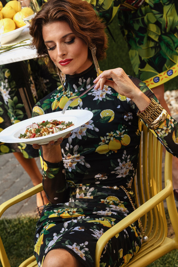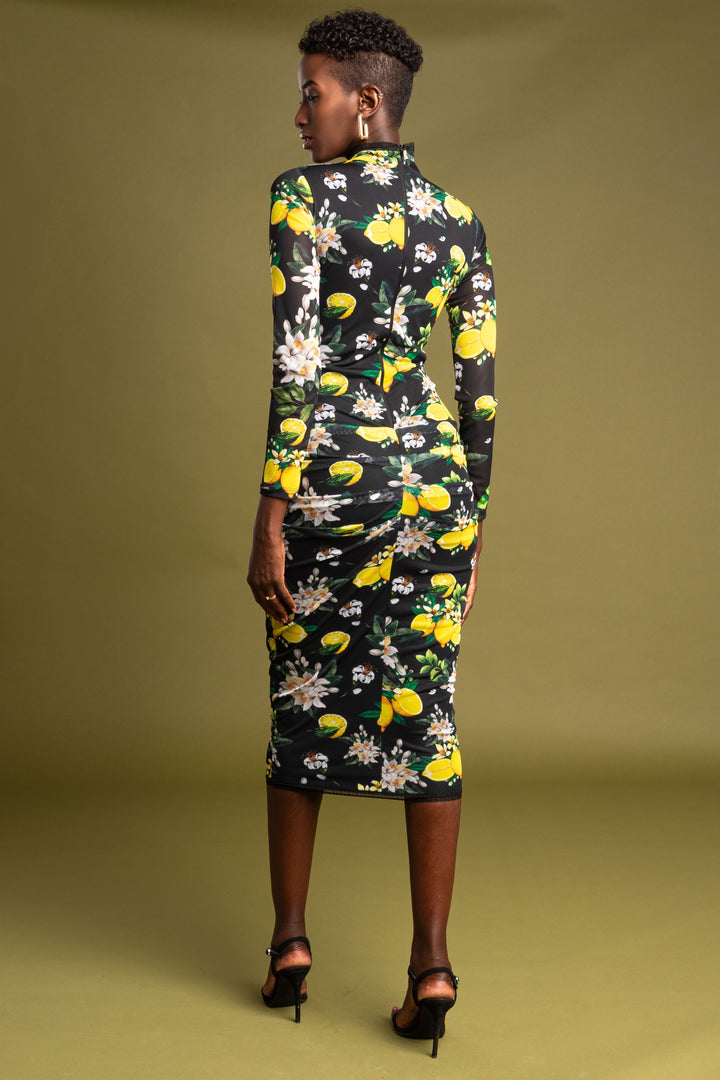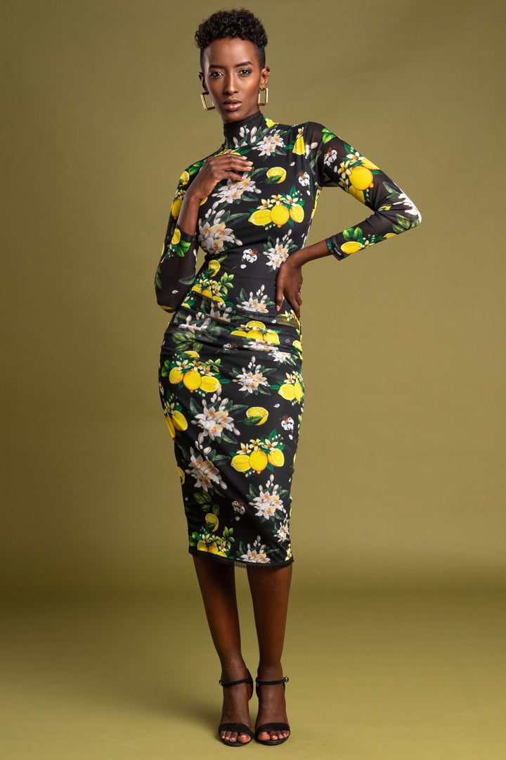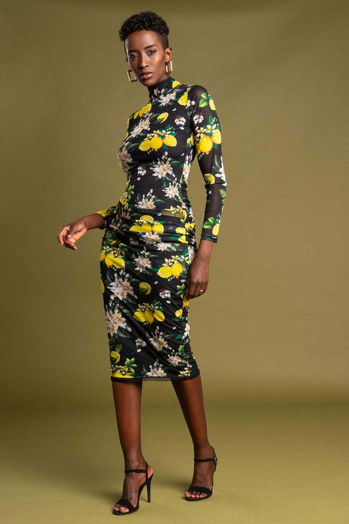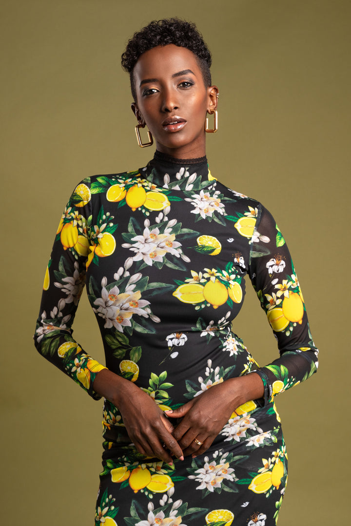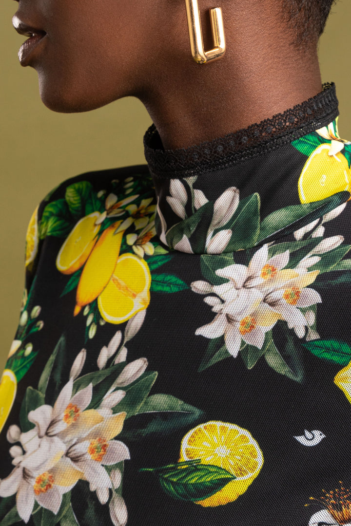 Update your wardrobe with our latest collection. Get your favorite style, featuring a black lace background with printed graphics of lemons, leaves and flowers.