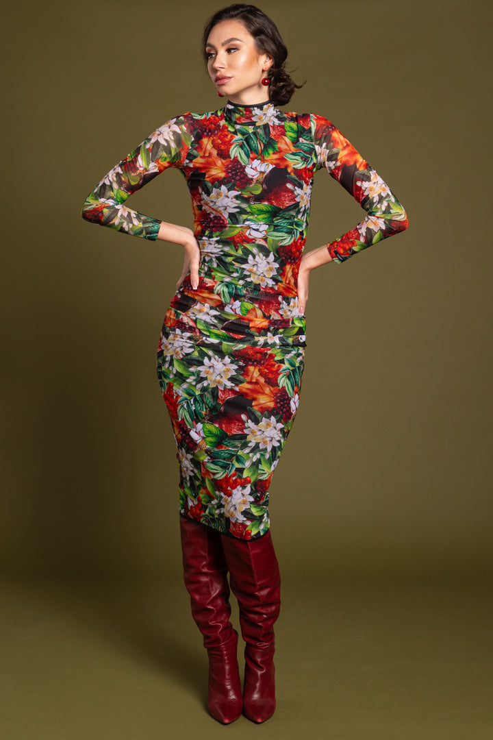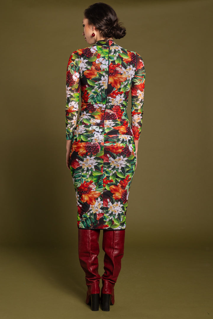 Long-sleeved, mid-calf-length, form-fitting dress. High, turtleneck and hem edged with a narrow strap. Pulled on both sides at the hips, opens with a zipper in the middle of the back. Sleeves