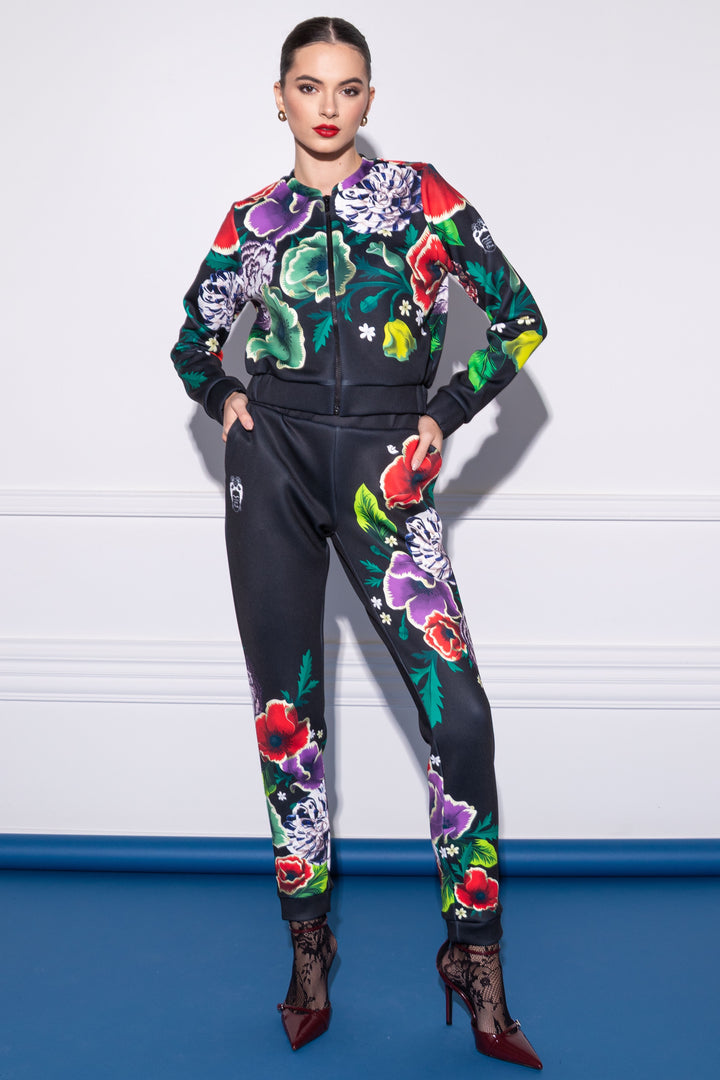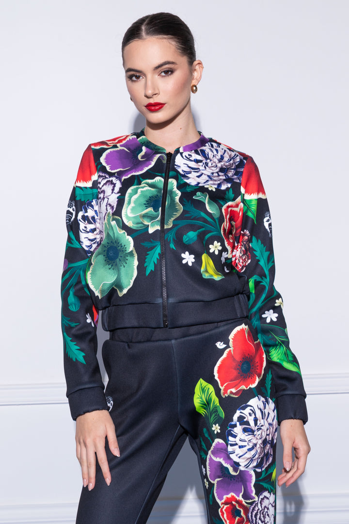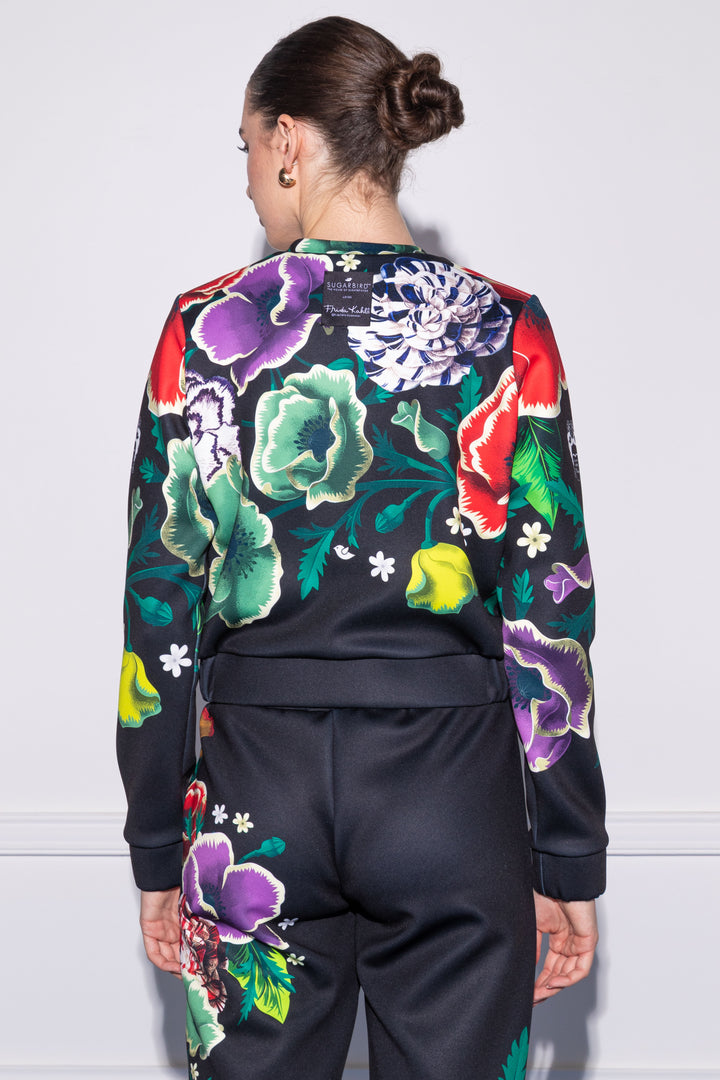 Long-sleeved, waist-length, straight-cut jacket. Round neck with tailored collar. Elastic waistband and cuffs, center front zip. Back SUGARBIRD We decorated it with a label that says LOVES FRIDA KAHLO.