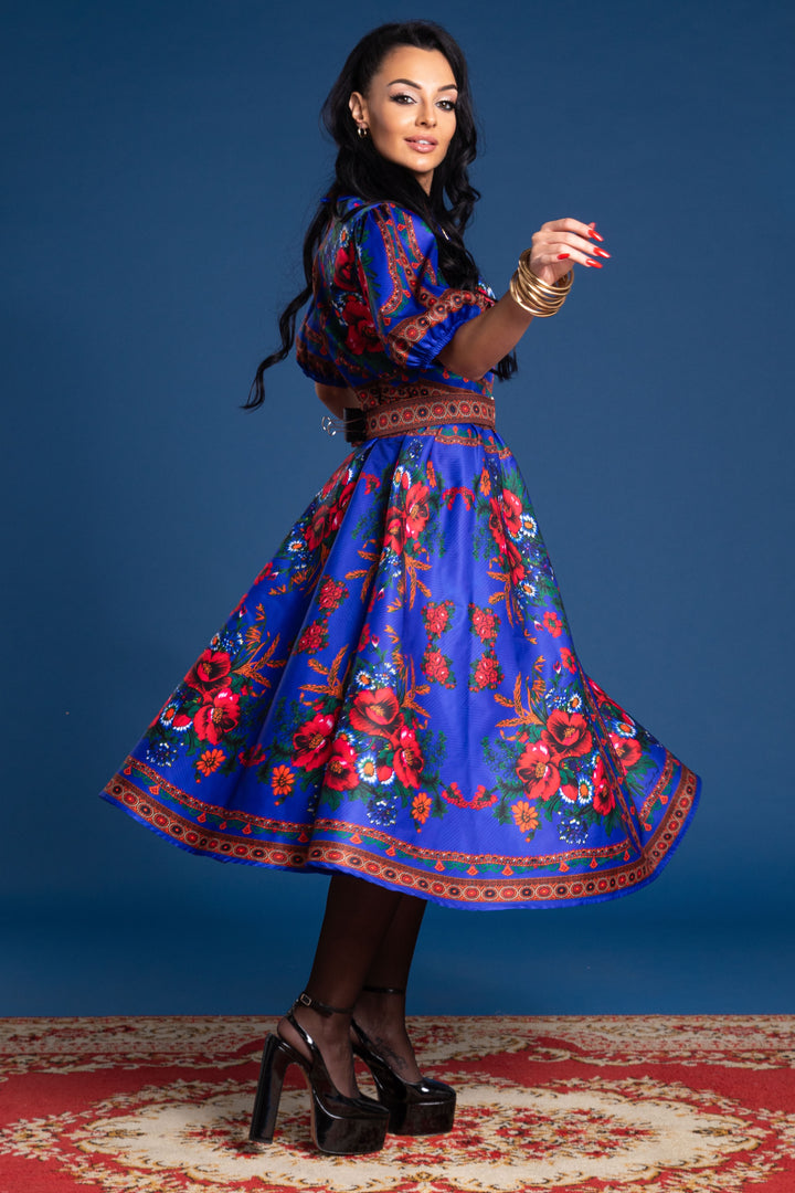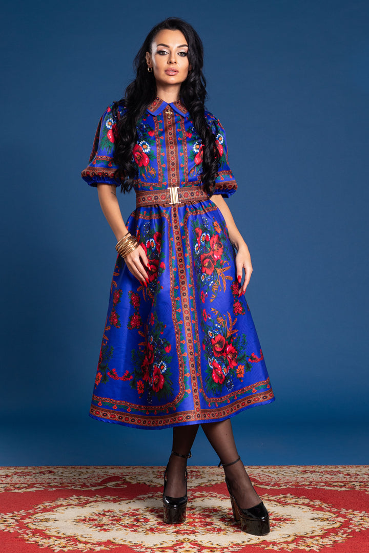Mid-calf length dress with three-quarter length and puff sleeves. The neck is fitted with a collar and the back is open with a zipper. It is narrowed at the waist, the skirt is richly drawn and flares downwards. To the front SUGARBIRD We sewed a label with the inscription.