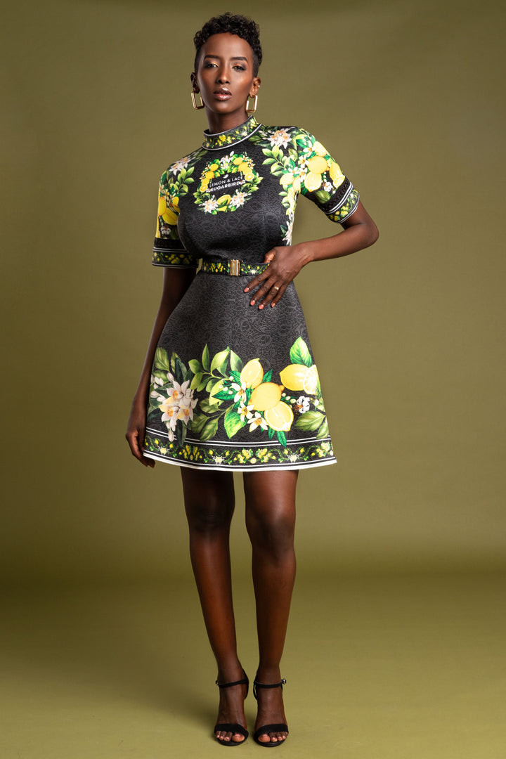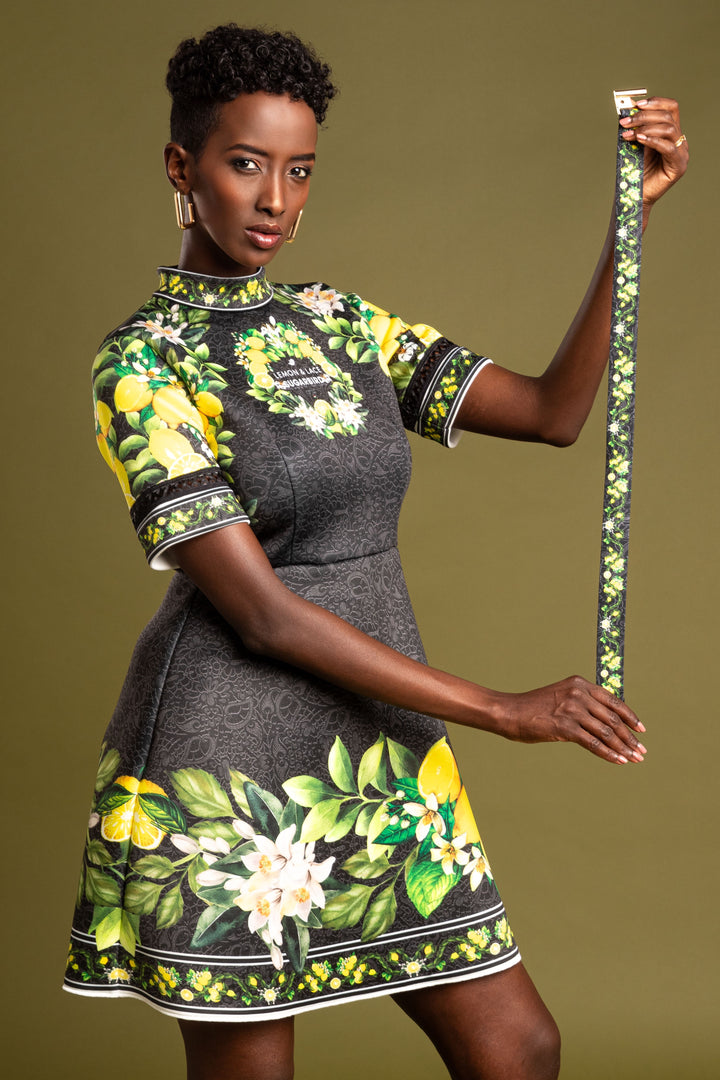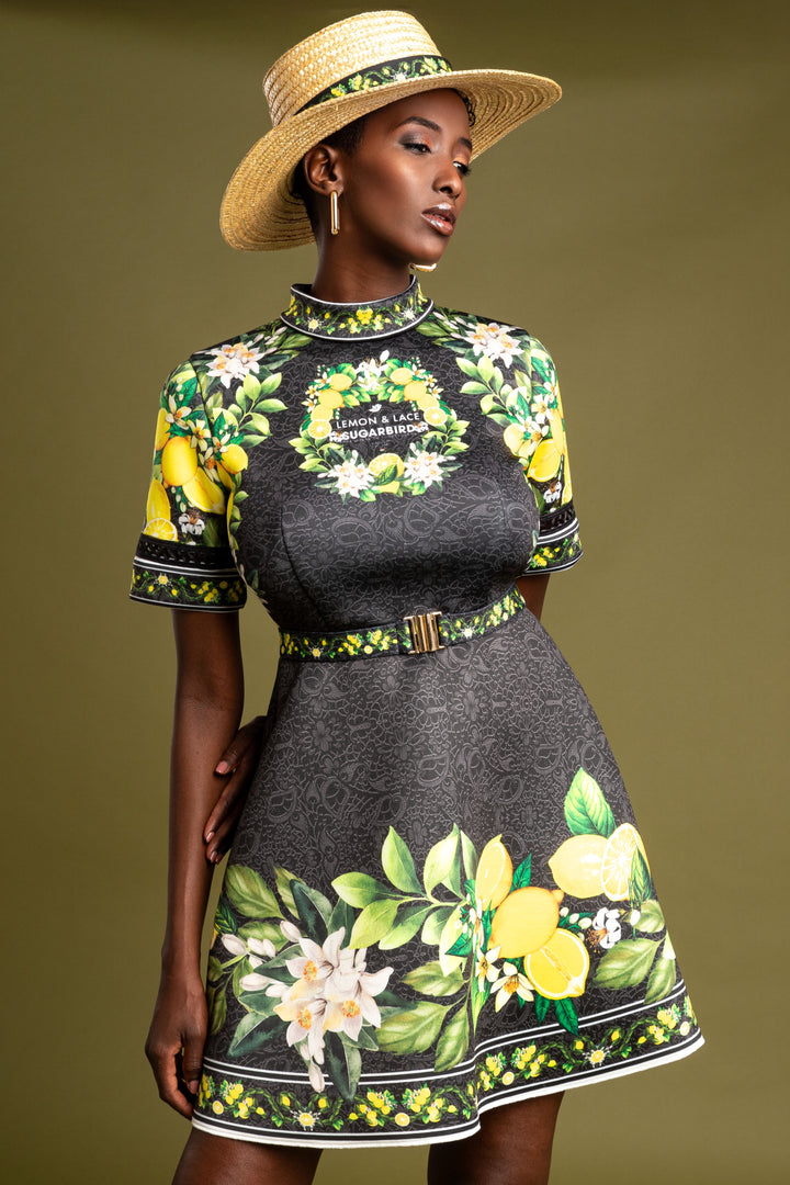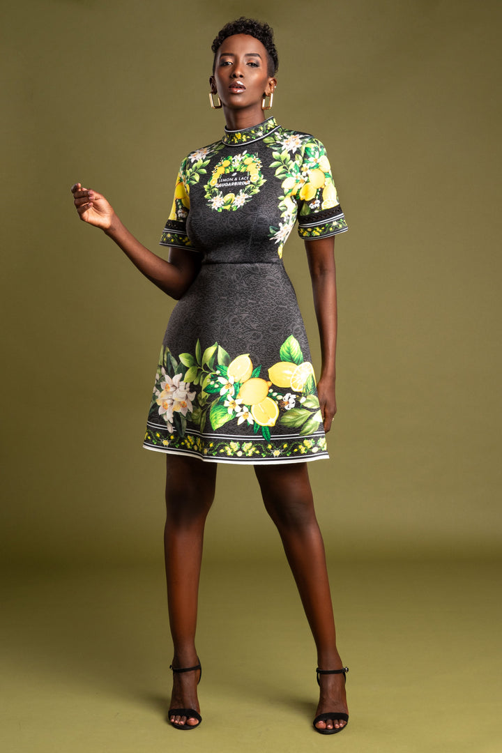 Update your wardrobe with our latest collection. Get your favorite style, featuring a black lace background with printed graphics of lemons, leaves and flowers.