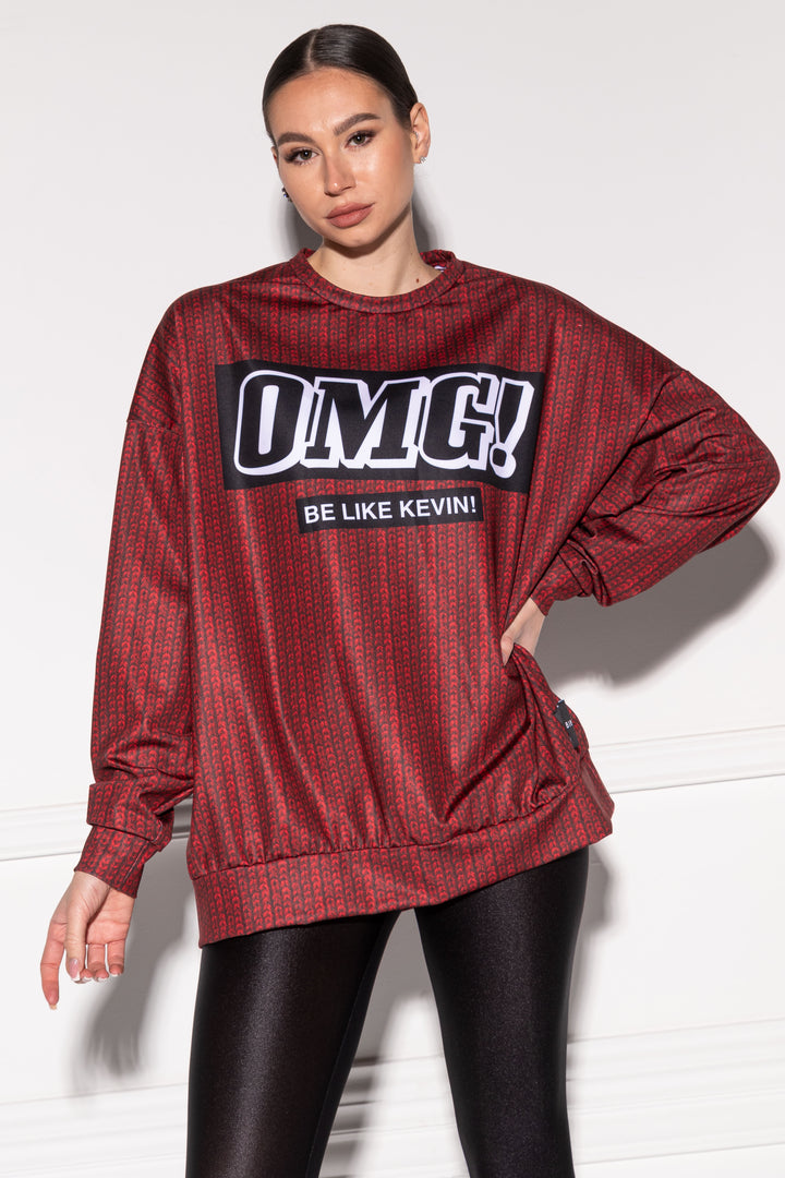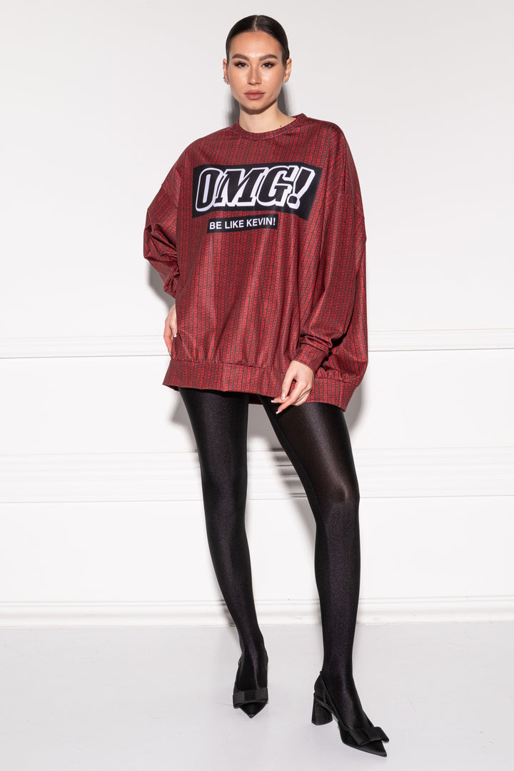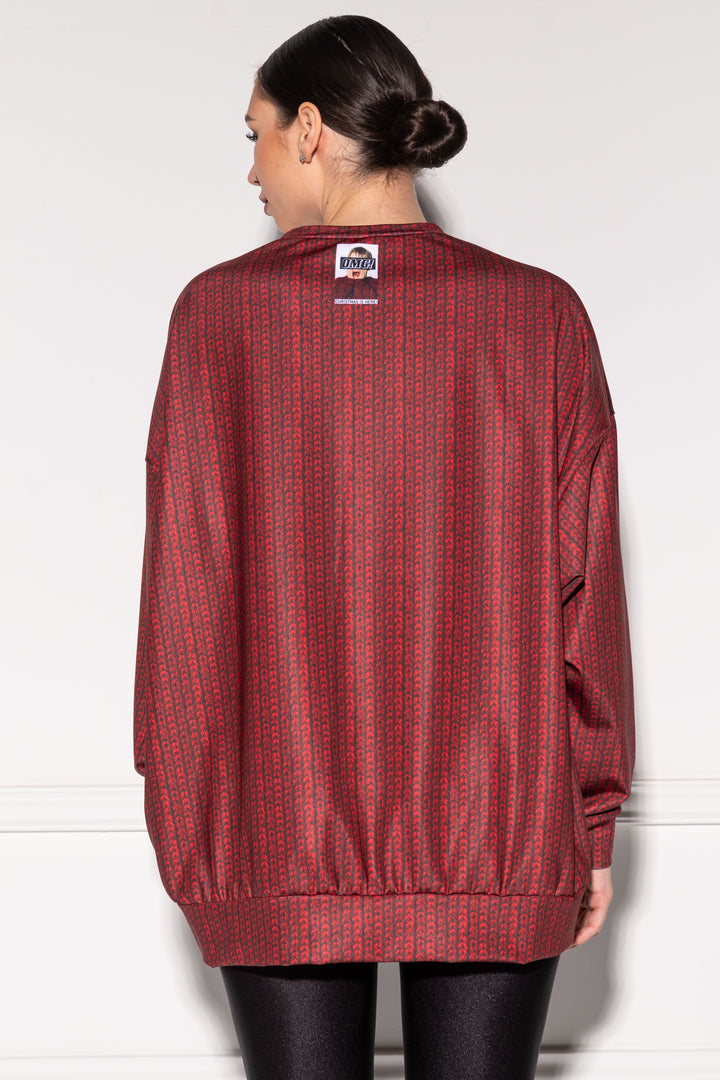 Long-sleeved, dropped-shoulder, loose-fitting sweater that falls below the hips. Round neck, hem and cuffs are hemmed with folded straps. Front