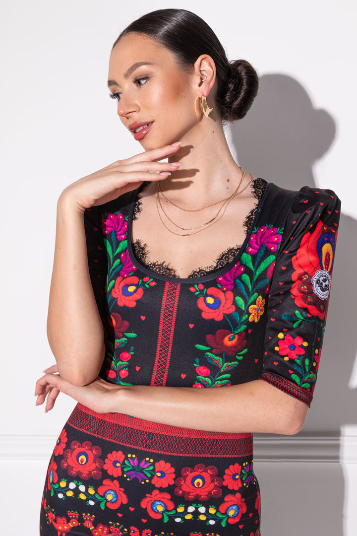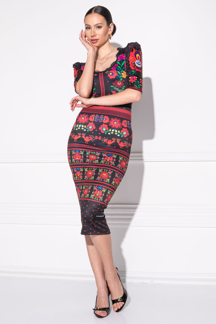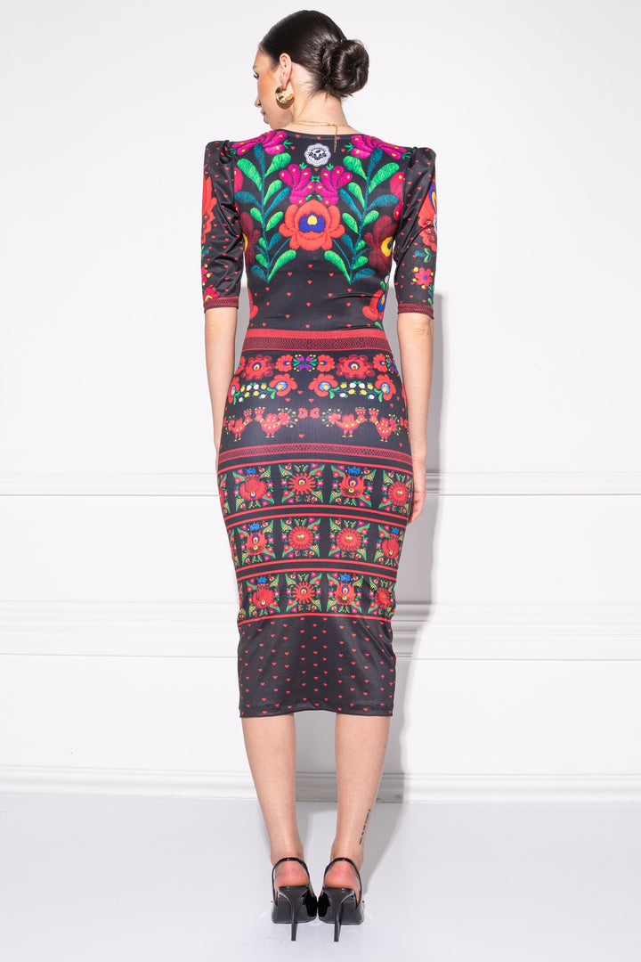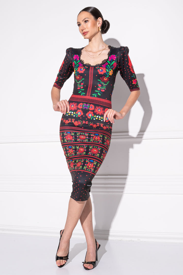A mid-calf length, form-fitting dress with puff sleeves. It has a curved neckline, which is edged with a narrow strap. To the front