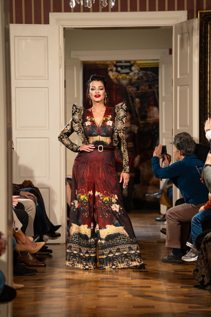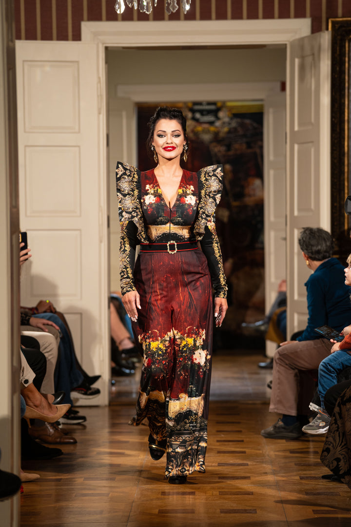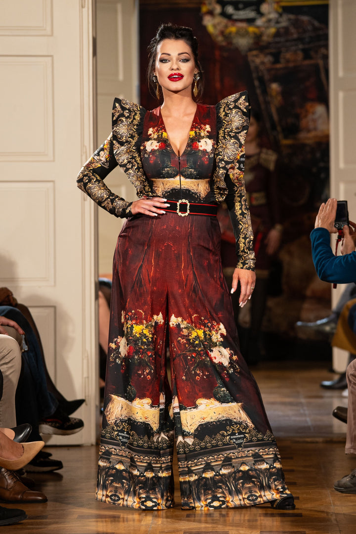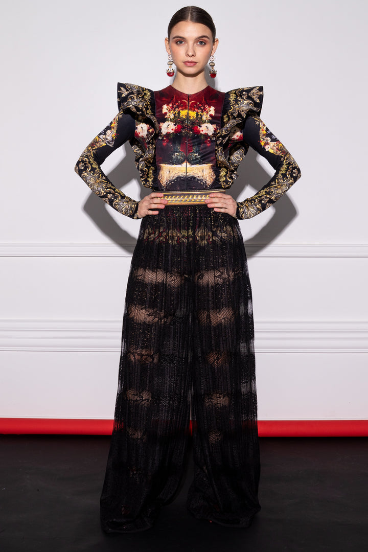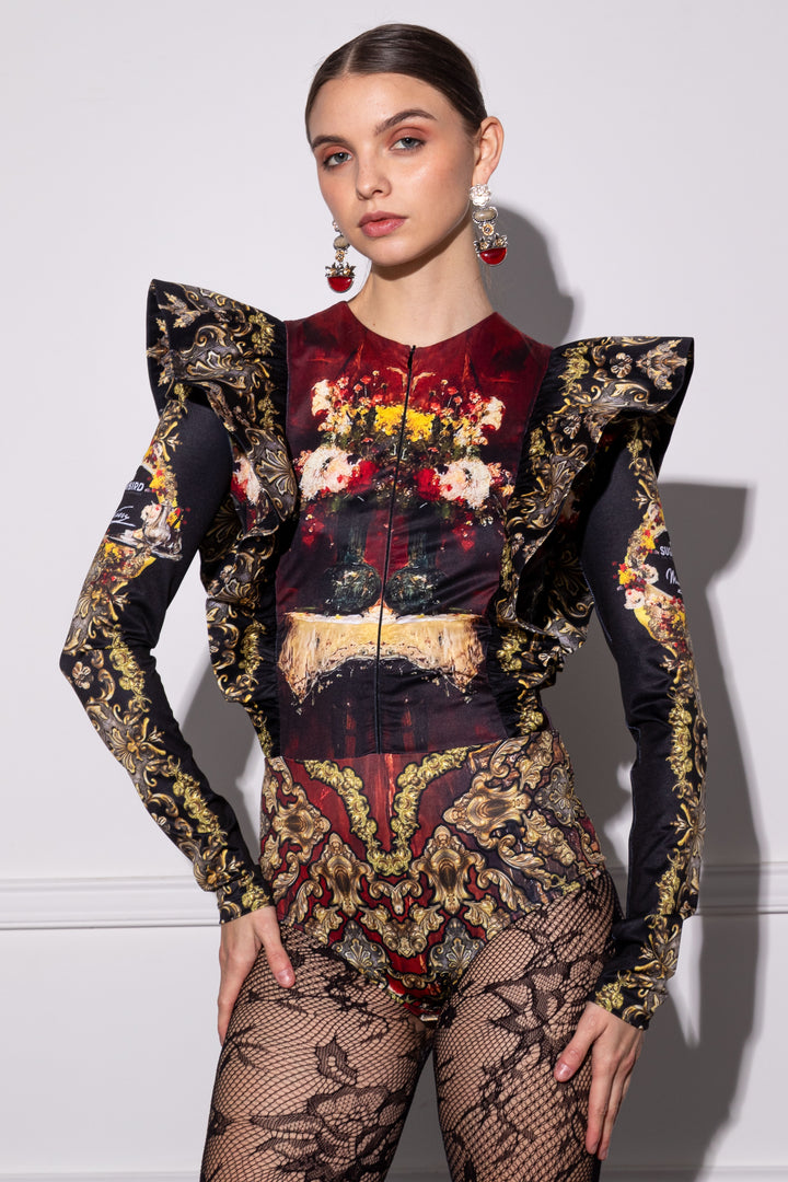 Hosszú ujjú, alak követő, bélelt body. Eleje közepén zipzárral nyitható. Vállait széles, húzott fodor díszíti. Alul gumizott combrésszel, ülepén állítható kapoccsal záródik.