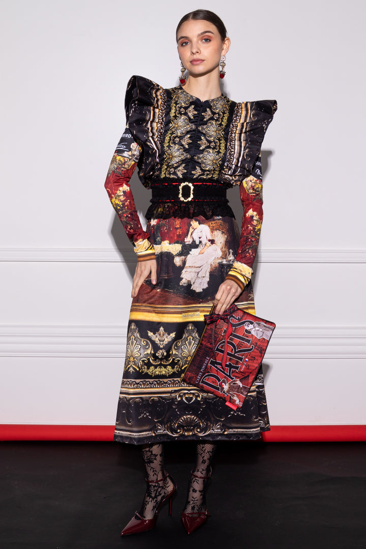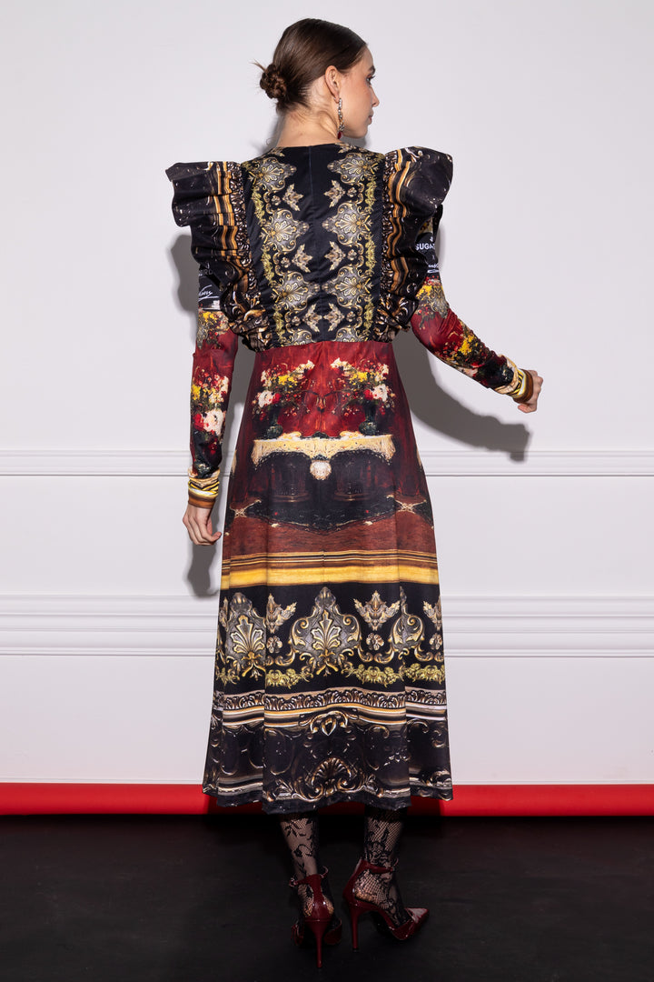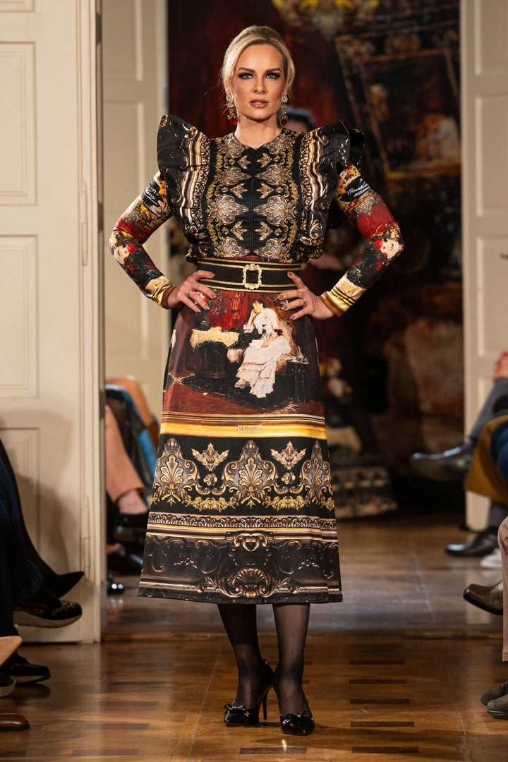 Térd alatti hosszúságú, hosszú ujjú ruha.  Felső részén alak követő és bélelt, szoknyarészén bővülő, „A” vonalú. Vállait széles, húzott fodor díszíti. Eleje közepén, derékig zipzárral nyitható.
