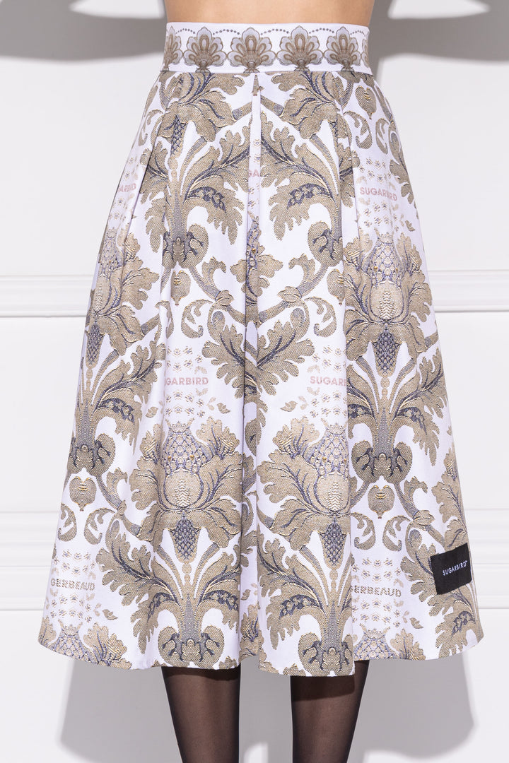 A-line skirt, below the knee length. The waist is shaped by pleats at the front and back. It opens with a zipper at the center of the back. The style is SUGARBIRD decorated with a label.