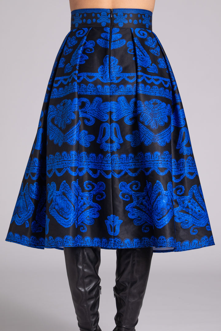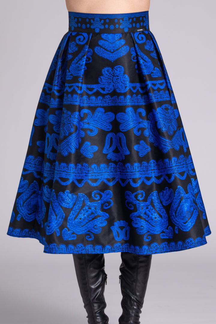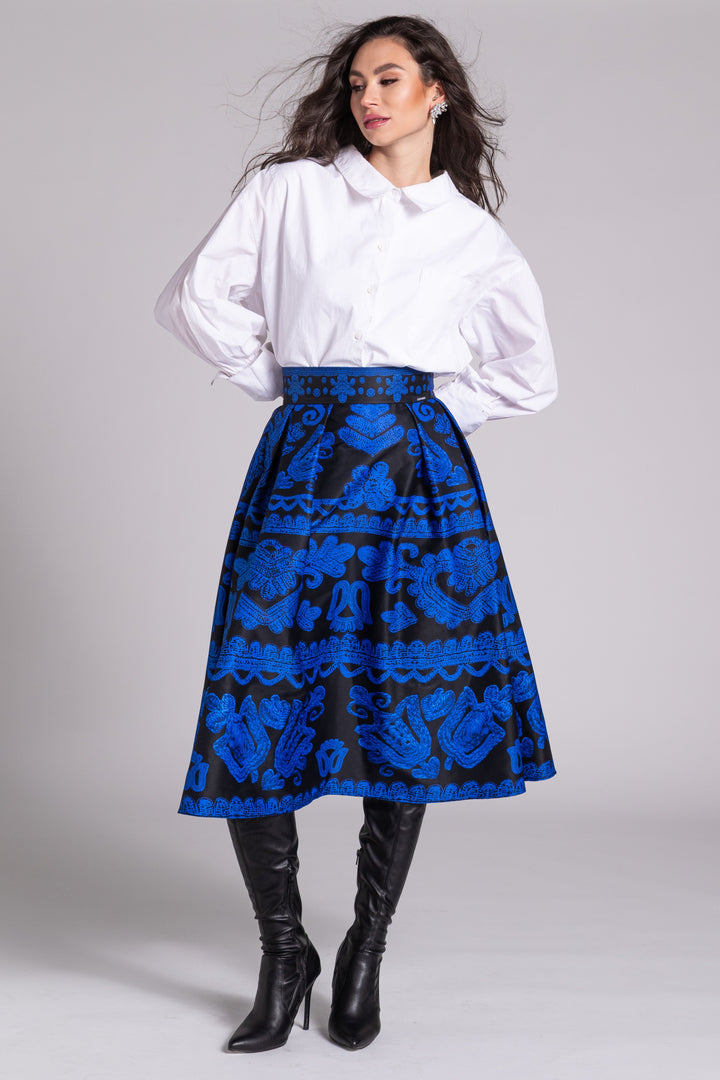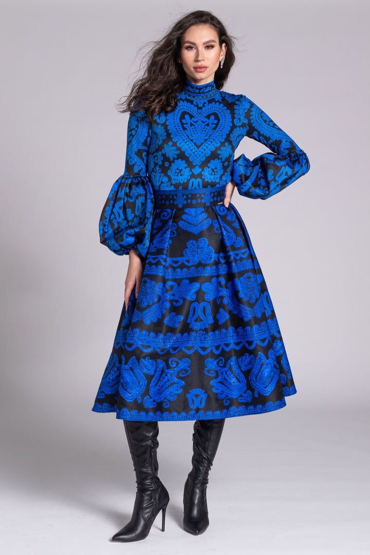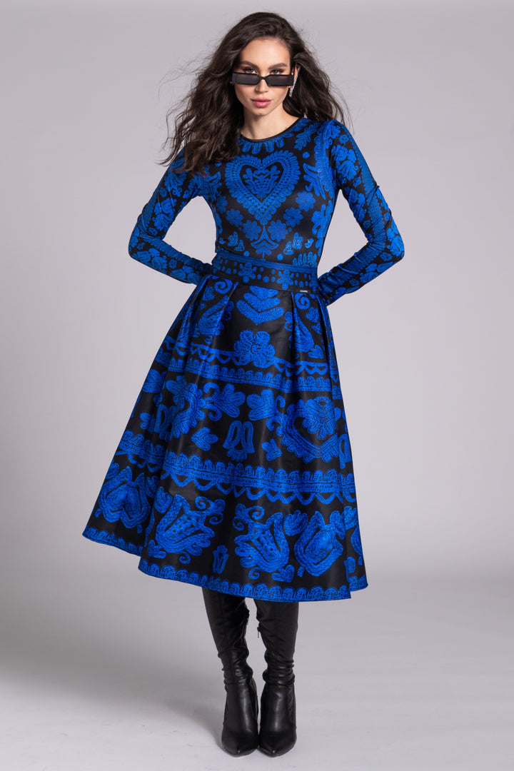 The pattern of our collection is decorated with graphics printed in blue on a black background, based on the Kalotaszeg written embroidery found in Transylvania.
