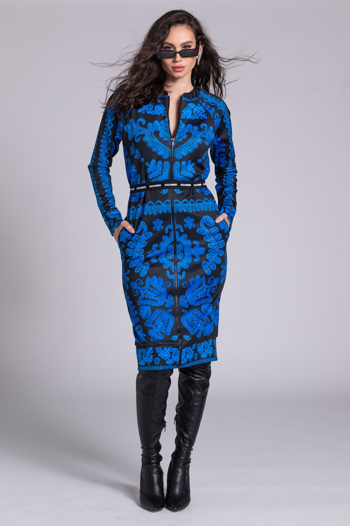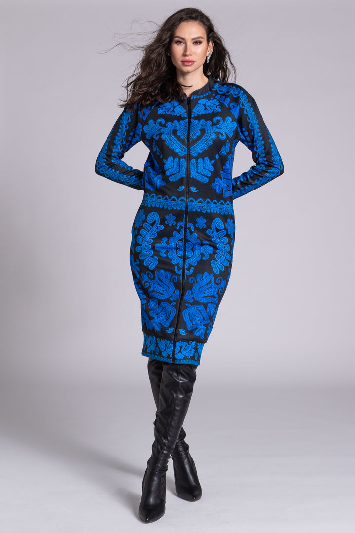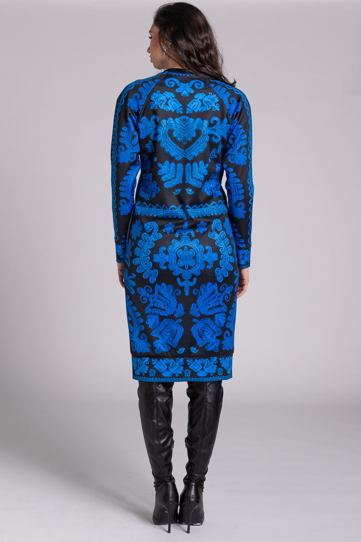 The pattern of our collection is decorated with graphics printed in blue on a black background, based on the Kalotaszeg written embroidery found in Transylvania.