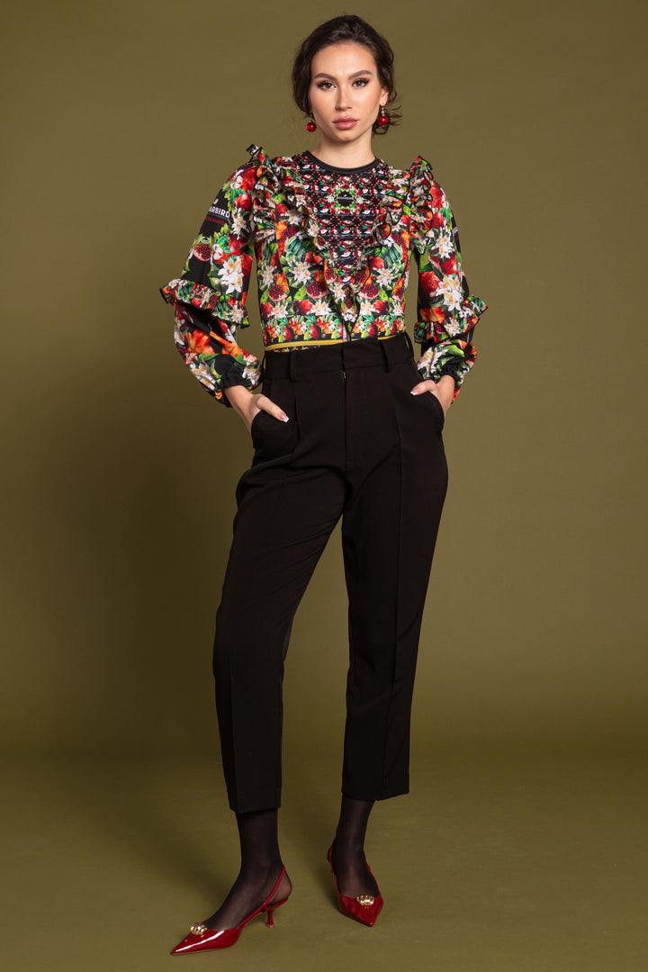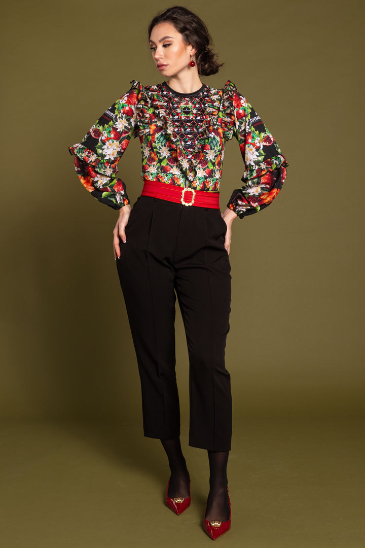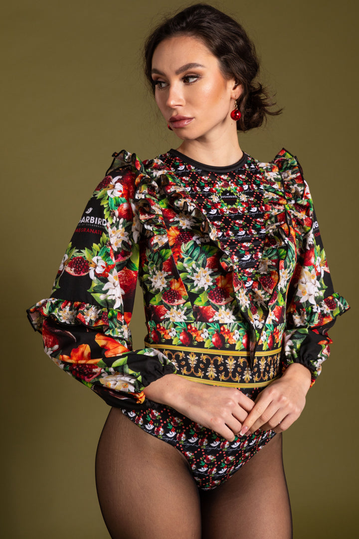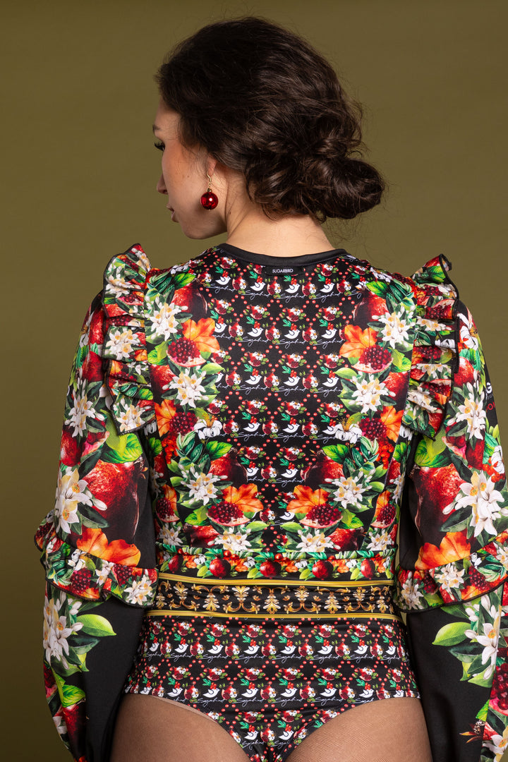 Long and puffy sleeve, form-fitting bodysuit. The sleeves, shoulders and front are decorated with ruffles drawn along the cut line. The bottom of the sleeves is elasticated. The closed round neck is edged with a narrow strap. It closes with an elasticated thigh section at the bottom and an adjustable clasp at the bottom. On the back