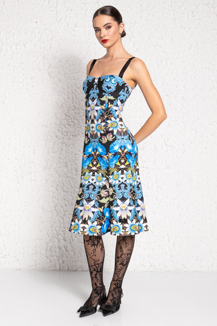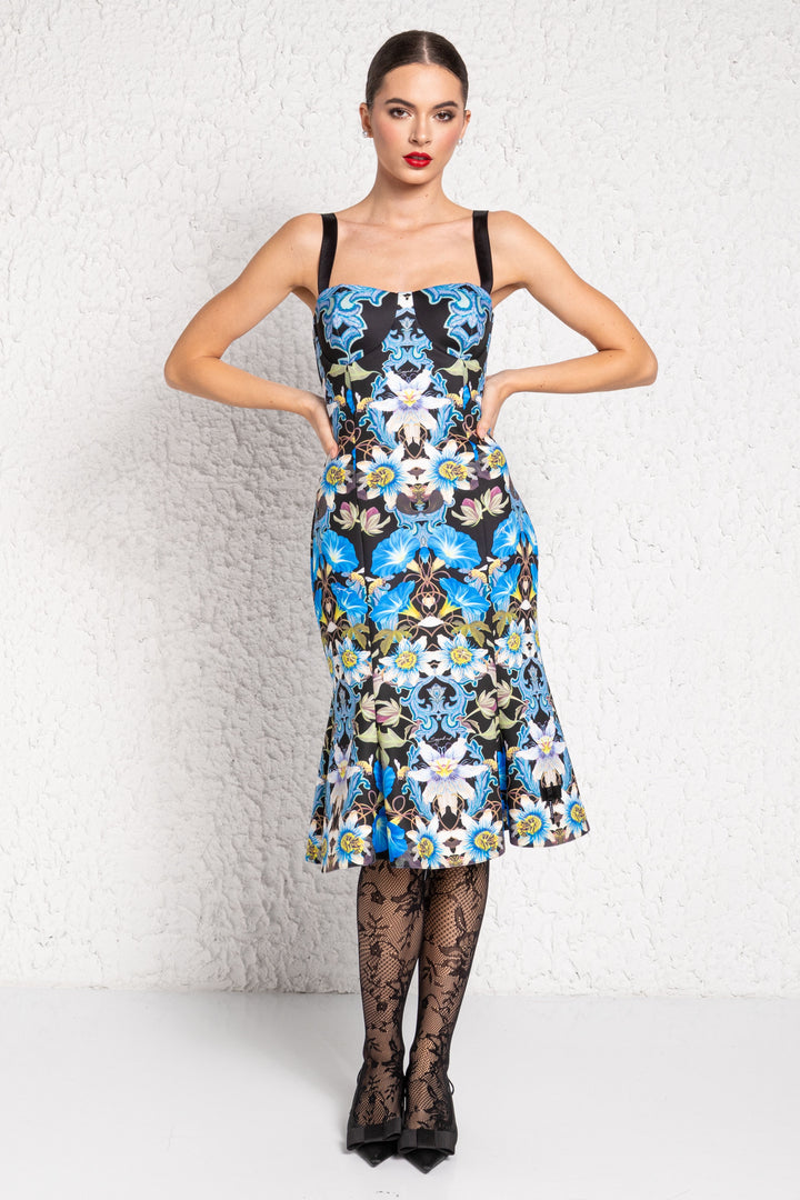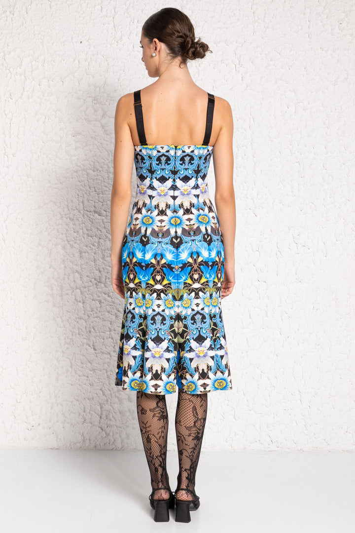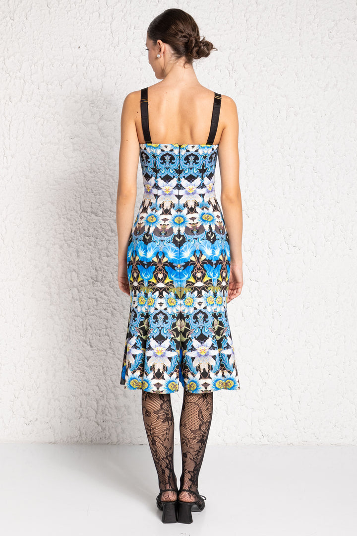 A form-fitting, knee-length, lined dress with wide shoulder straps. The skirt is slightly flared at the bottom. It opens with a zipper in the middle of the back. At the front SUGARBIRD It is decorated with a label and a bow accessory.