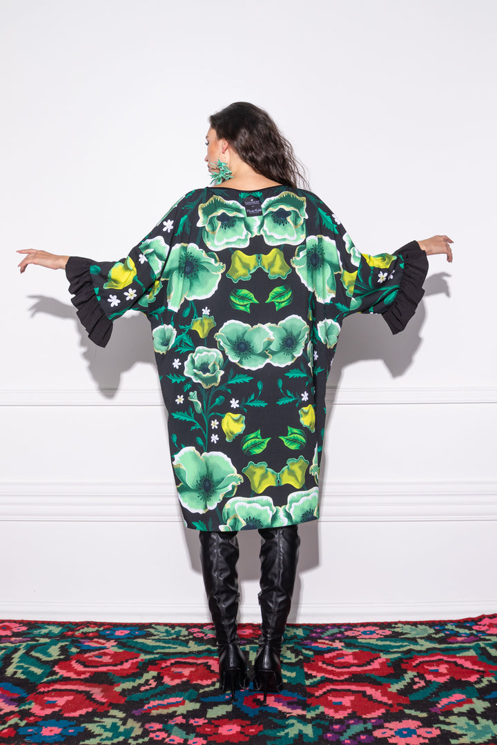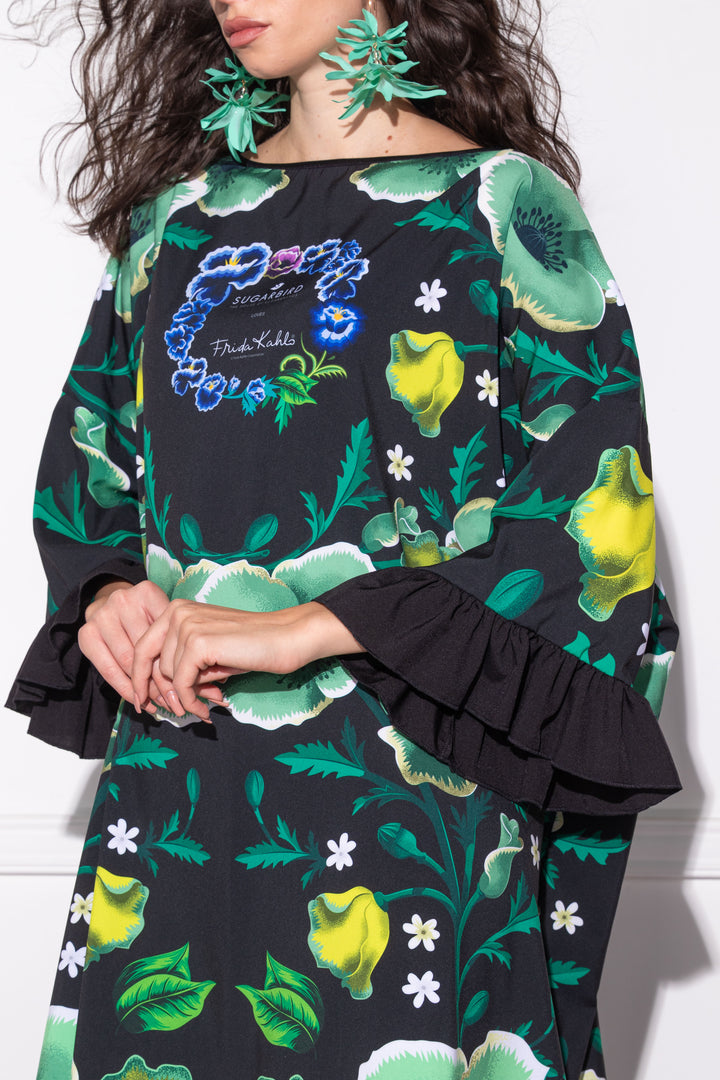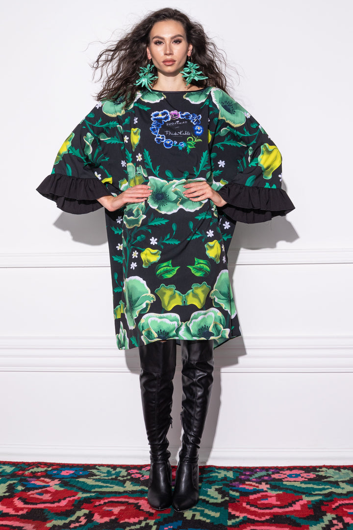 Long sleeves, knee-length, extra loose and loose fit tunic. Wide boat neck with narrow strap. Decorated with ruffles at the bottom of the sleeves. Back SUGARBIRD We sewed a label that said LOVES FRIDA KAHLO.