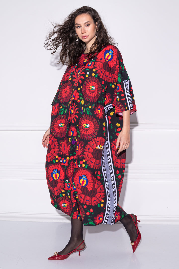 Short sleeves, mid-calf length, extra loose and loose fit tunic. Closed round neck with narrow strap. At the front SUGARBIRD decorated with a label.