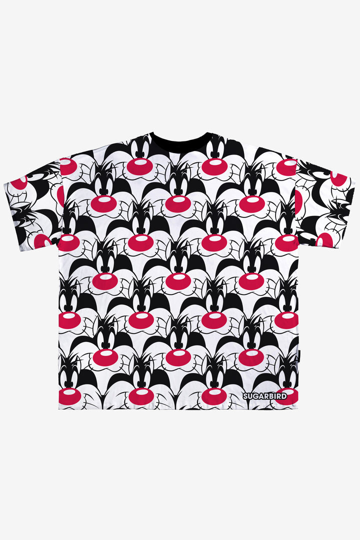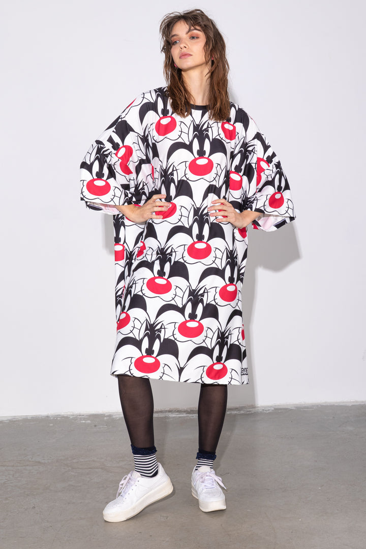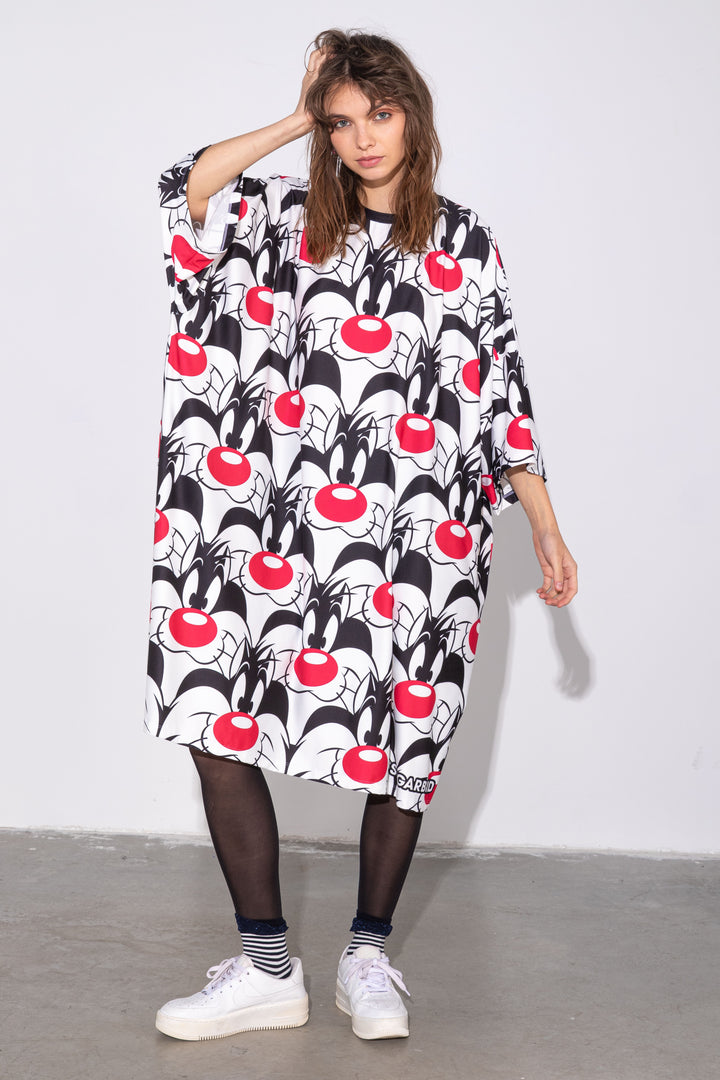 Short sleeves, knee-length, extra loose and loose fit tunic. Closed round neck with folded straps. The style is on the side SUGARBIRD decorated with a label.