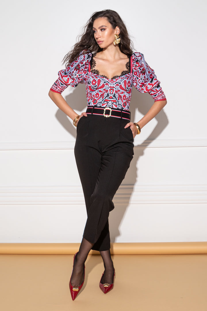 A form-fitting, lined bodysuit with puffy, three-quarter sleeves. The sleeves are edged with a wide strap, and the neckline is square and deep at the front. It closes at the bottom with an elasticated thigh section and an adjustable hook-and-eye fastener. On the sleeves SUGARBIRD We sewed a label with the inscription. The lace is not part of the product's neckline.
