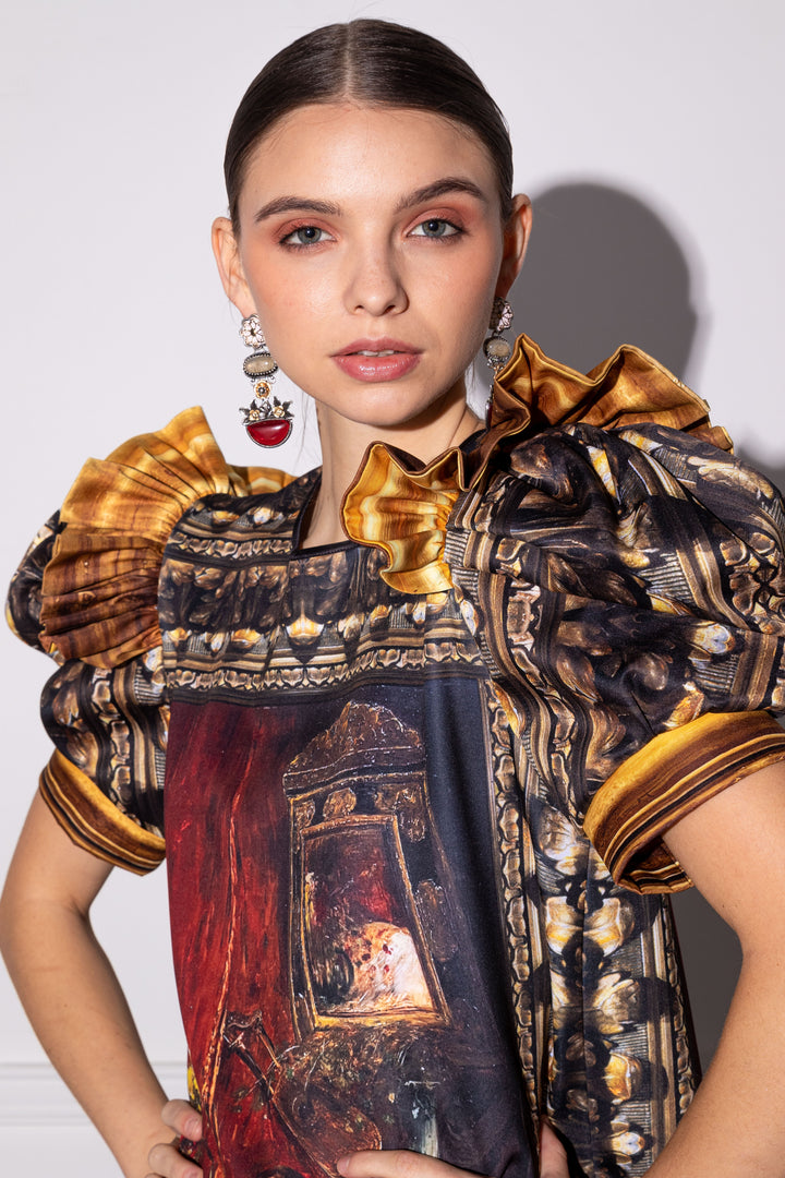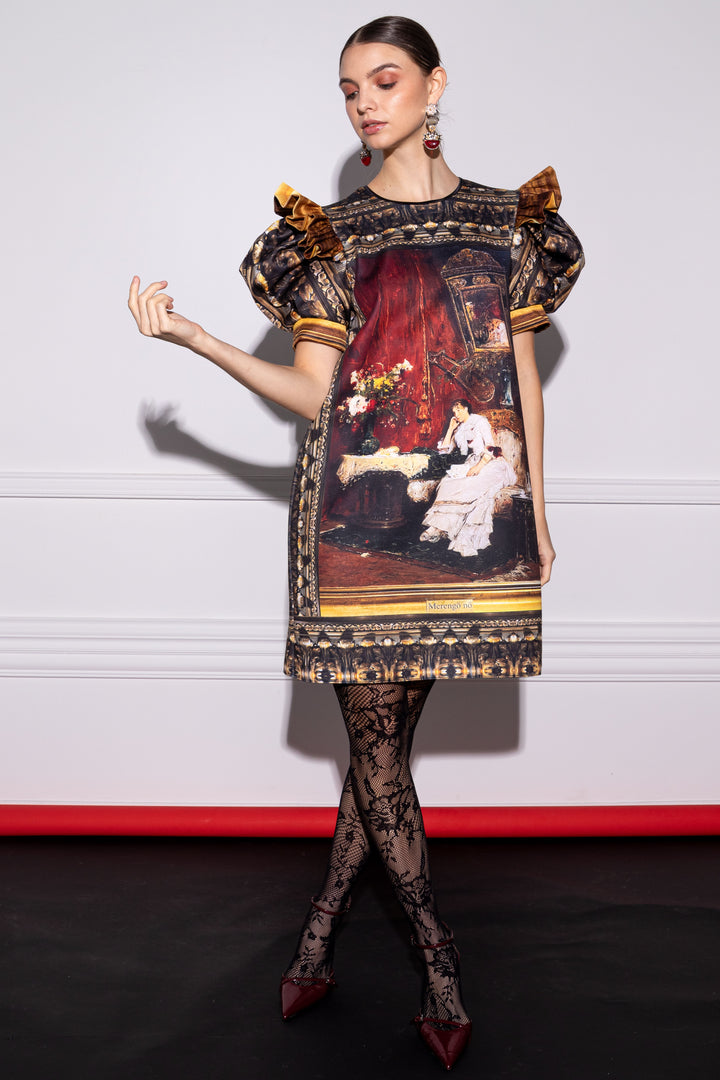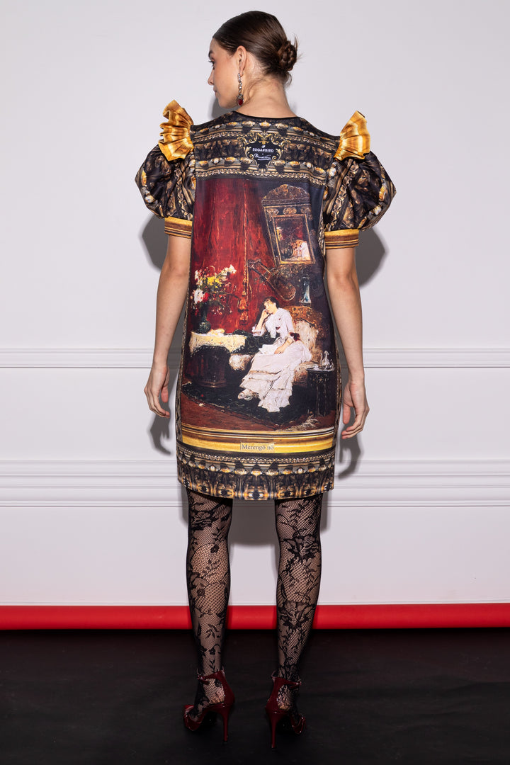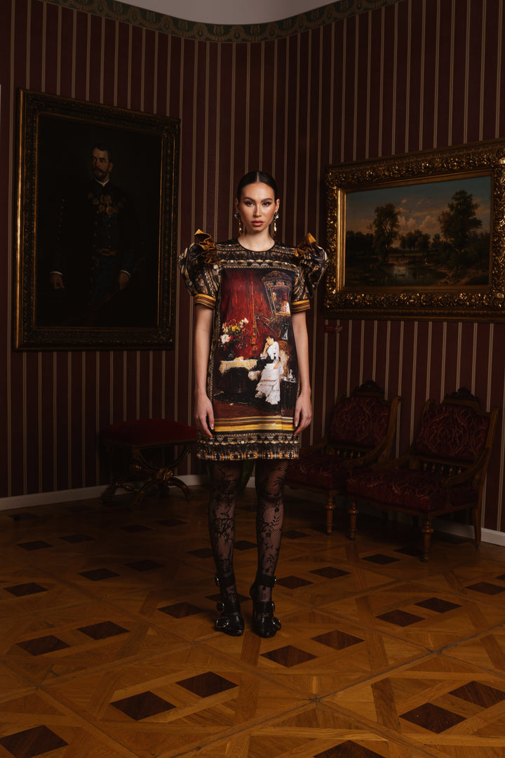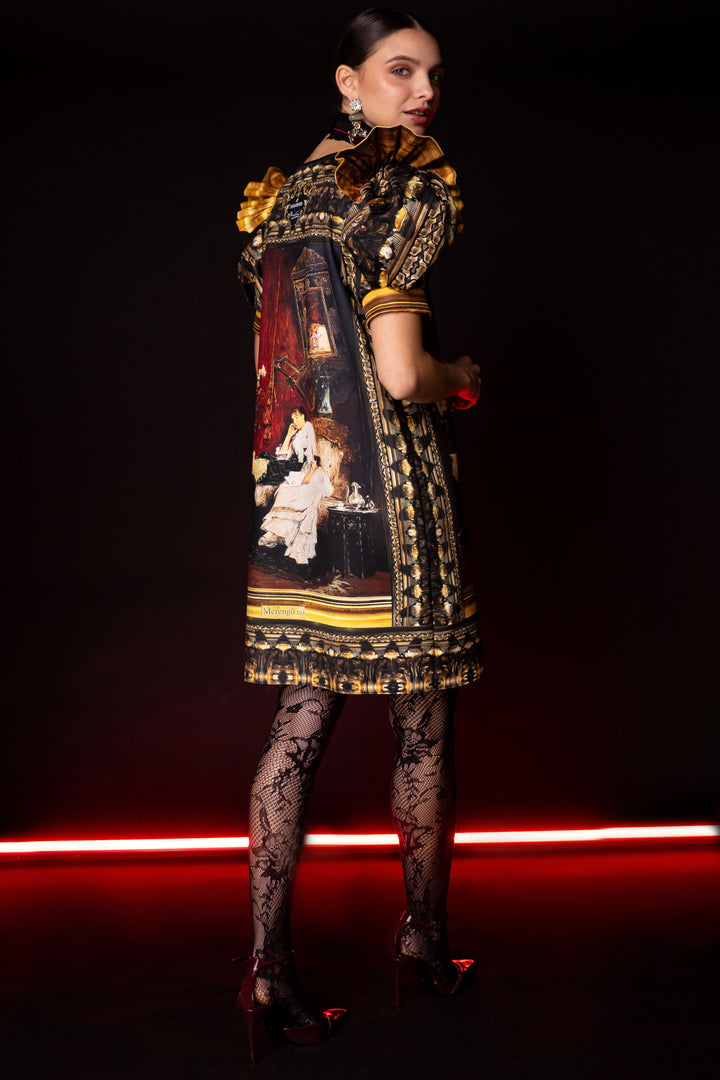 Combközép hosszúságú, rövid és puffos ujjú, bő fazonú ruha. Vállait húzott fodor díszíti. Zárt és kerek nyakköre keskeny, ujja alja félbehajtott pánttal szegett.