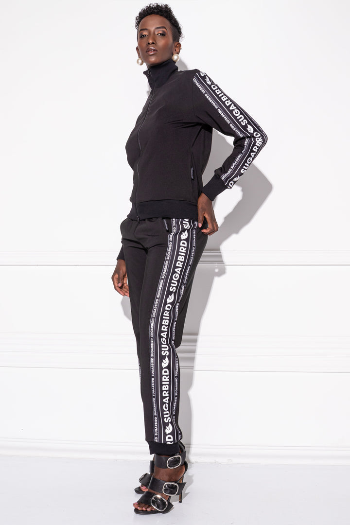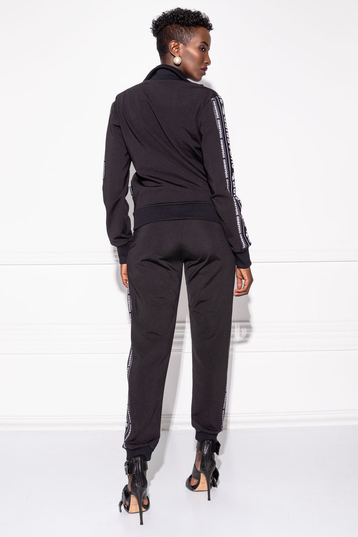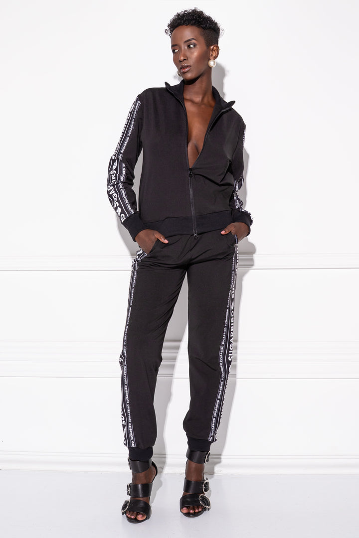 Long-sleeved cardigan, reaching above the hips, with a wide, passé fabric, folded in half strap at the neck, bottom and bottom of the sleeves. It opens at the front with a wide black zipper, and there are pockets on the sides. On the sleeves