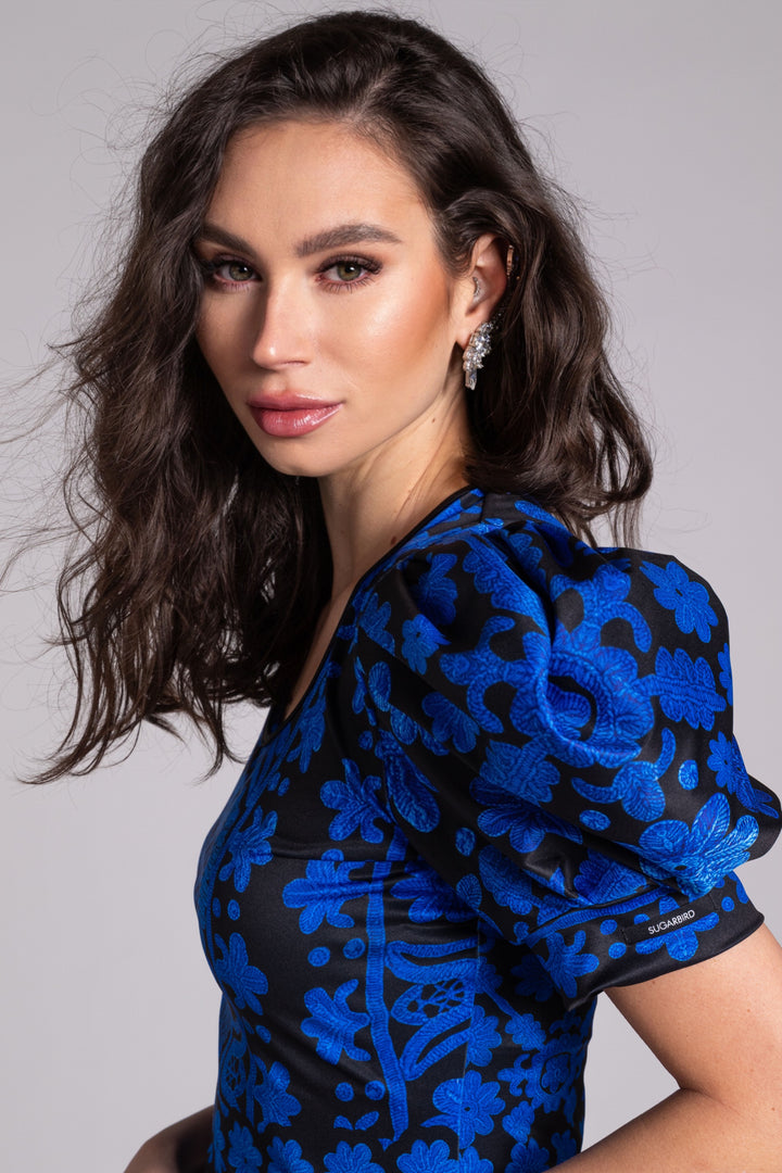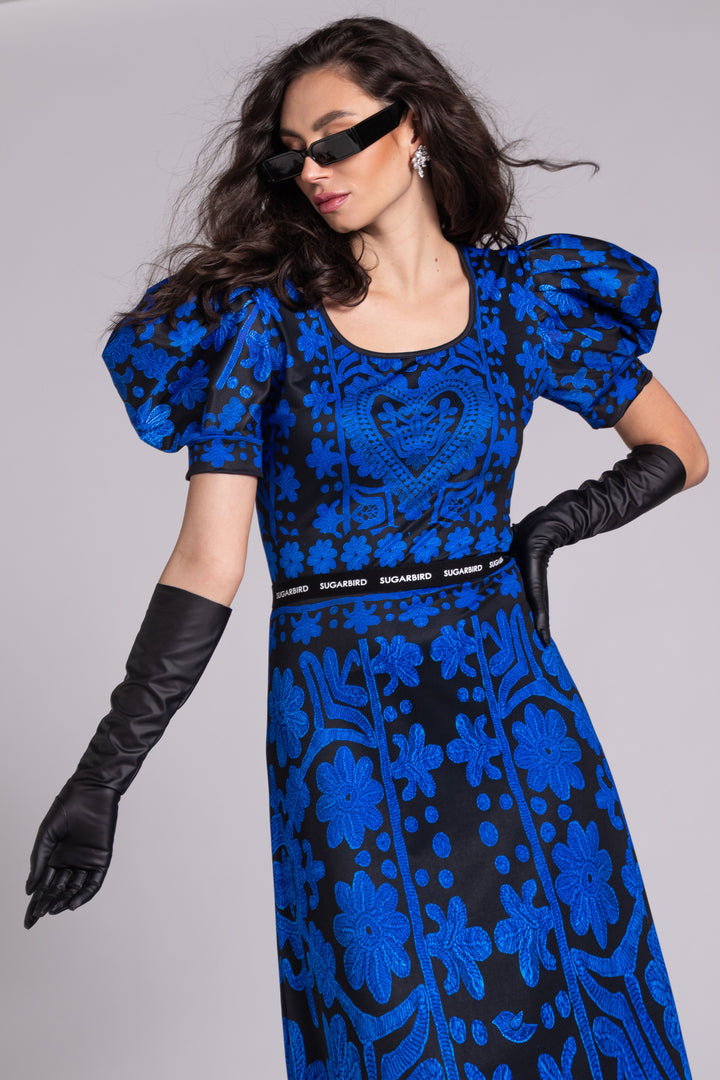 The pattern of our collection is decorated with graphics printed in blue on a black background, based on the Kalotaszeg written embroidery found in Transylvania.