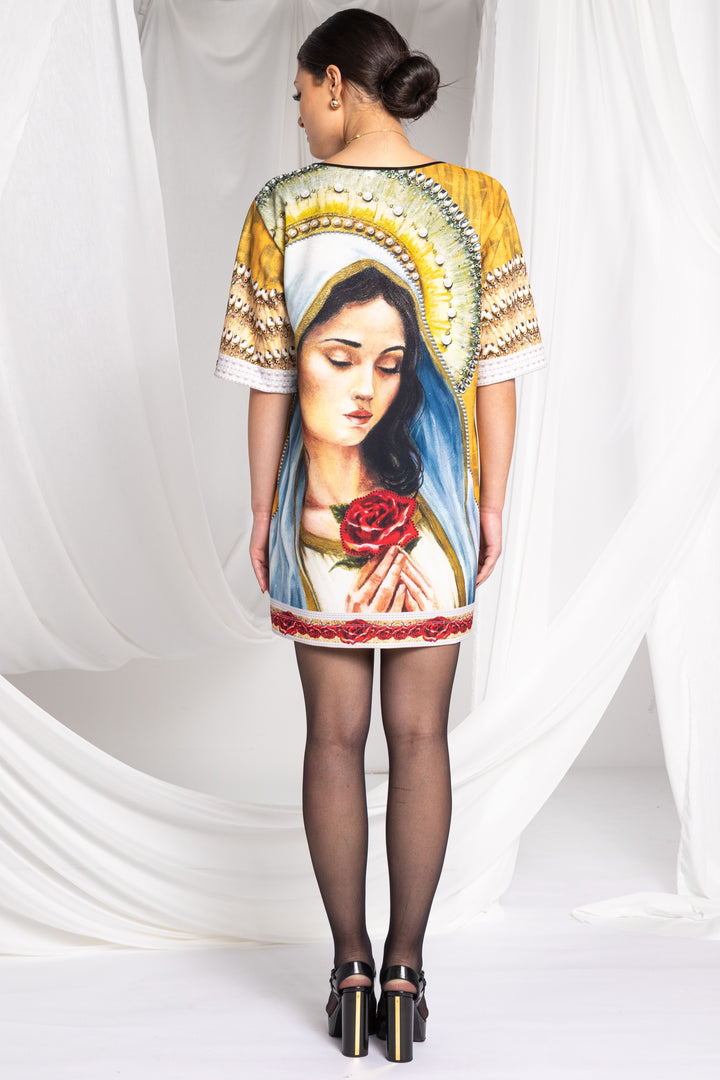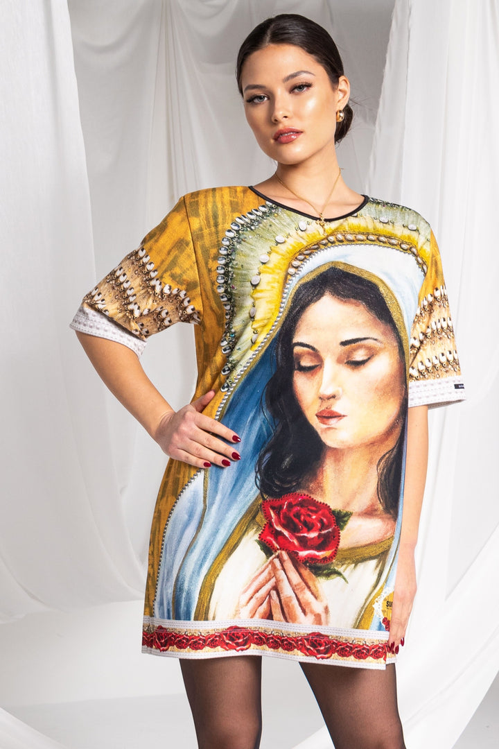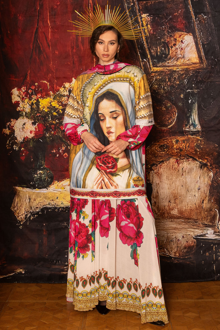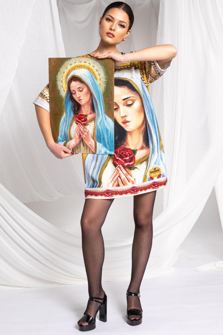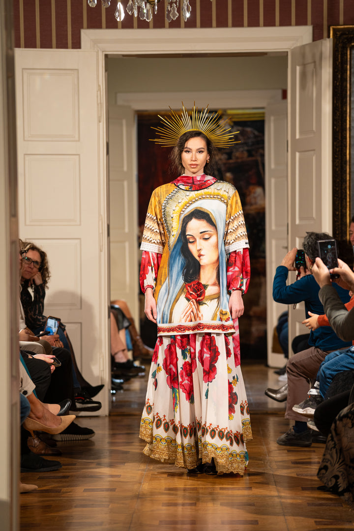 Discover the special pieces of our new Vive Maria collection, which feature the painted portrait of the Virgin Mary and its motifs as printed patterns.