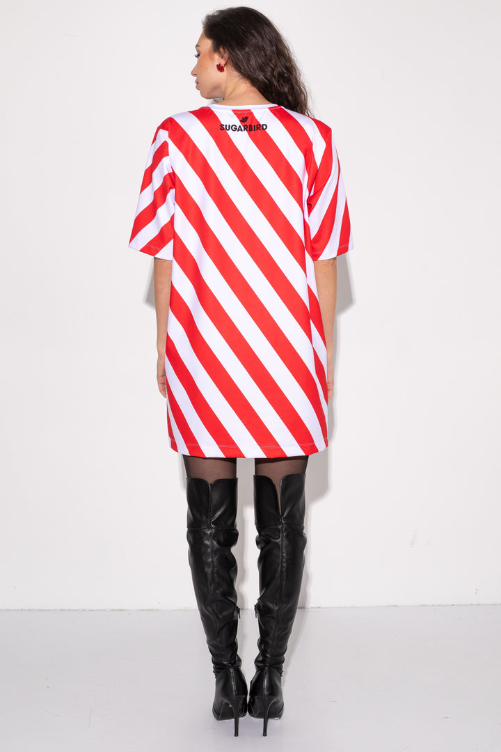 Rövid ujjú, térd fölé érő, laza és egyenes fazonú tunika. Zárt kerek nyaka félbehajtott pánttal szegett. Elejére SUGARBIRD feliratú címkét varrtunk.