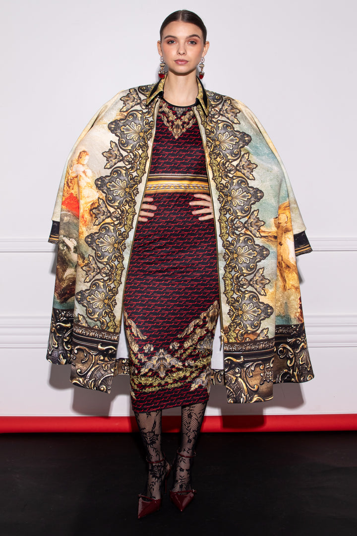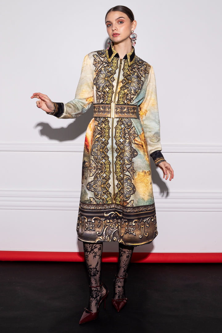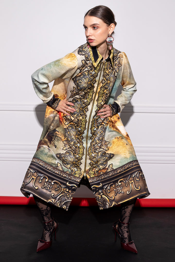 Vádliközép hosszúságú, hosszú ujjú, „A” vonalú kabát. Eleje közepén zipzárral nyitható, ujja alját félbehajtott pánt, nyakát szabott gallér szegi. Oldalaiba zsebeket helyeztünk.