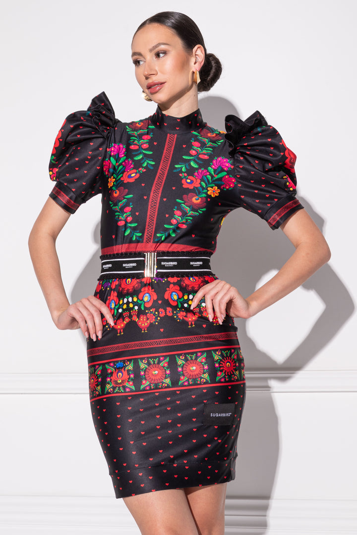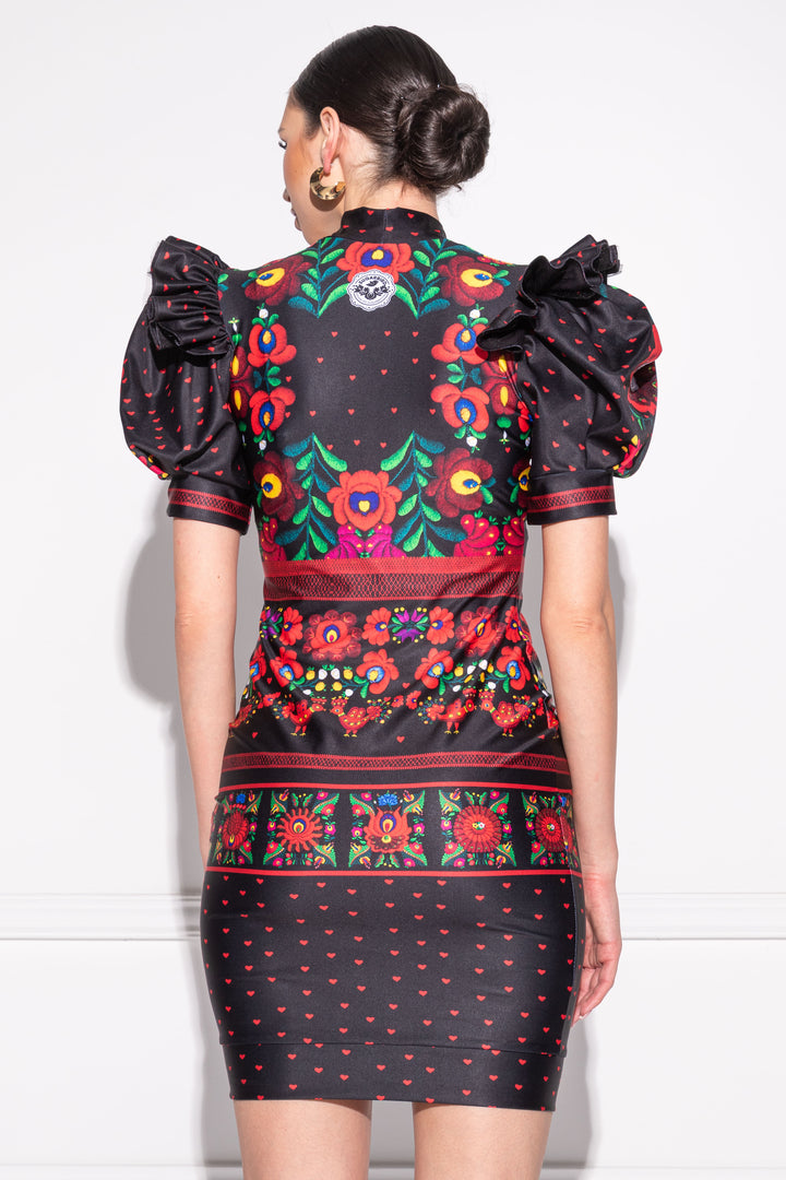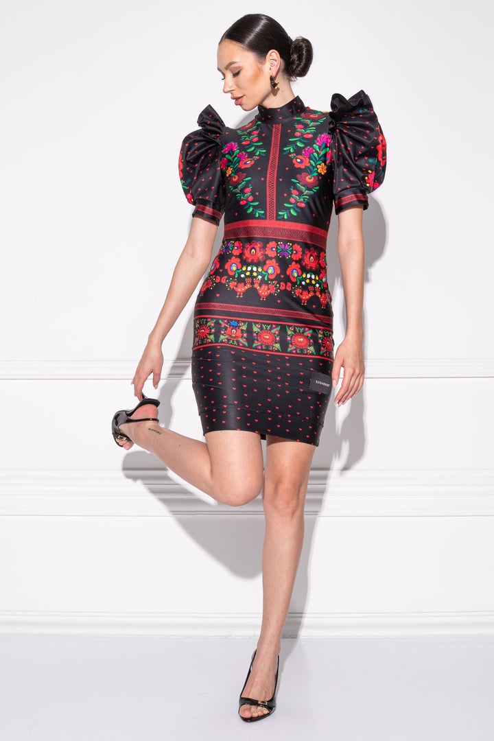 A figure-hugging dress with short puff sleeves and above-the-knee length. The neckline, hem and bottom of the sleeves are edged with a wide strap. The shoulders are decorated with ruffles drawn on both sides. The front