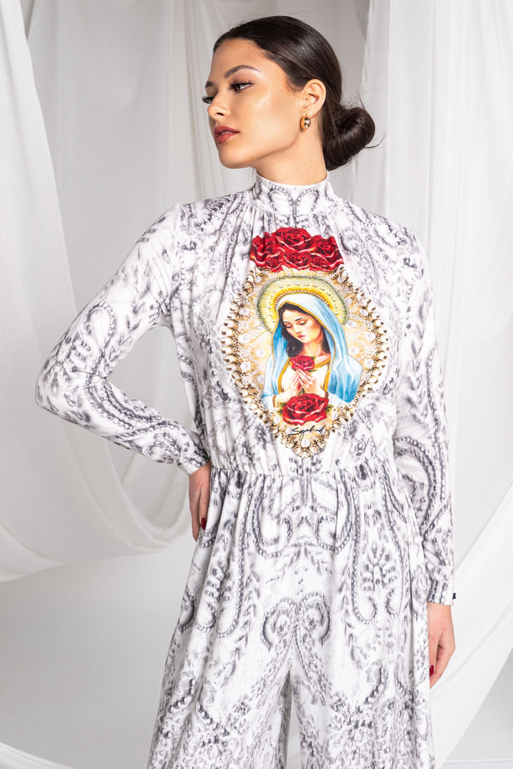Discover the special pieces of our new Vive Maria collection, which feature the painted portrait of the Virgin Mary and its motifs as printed patterns.
