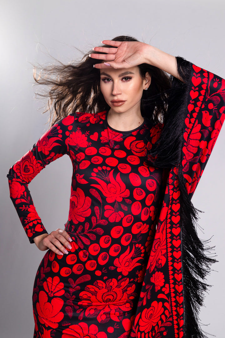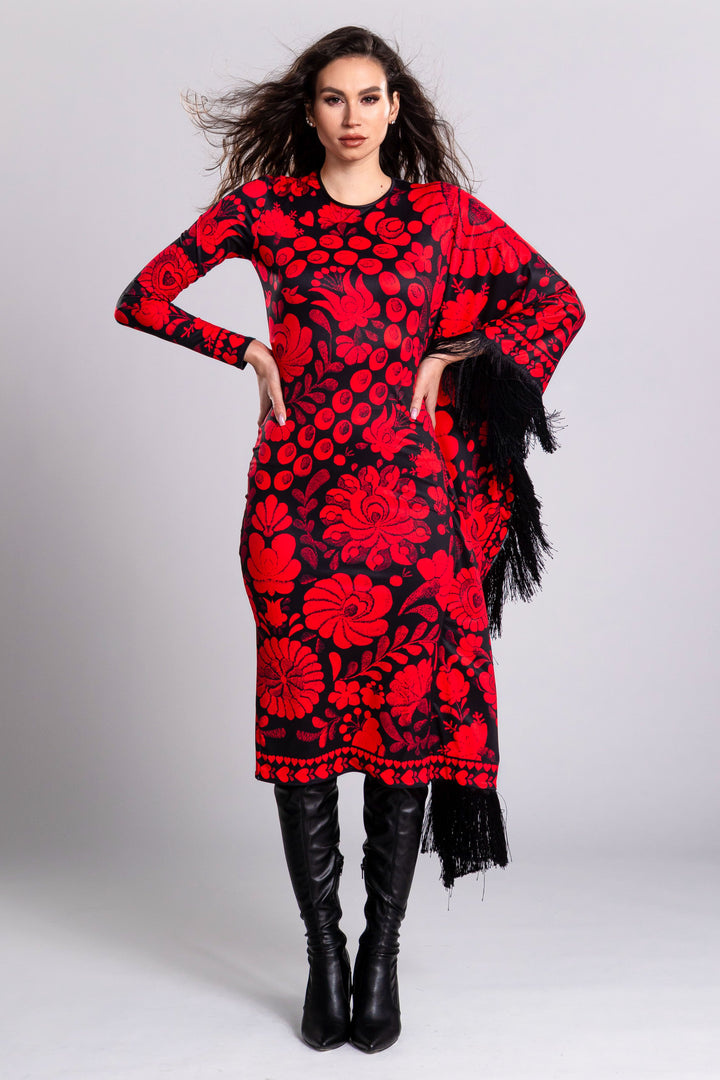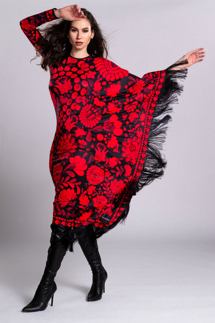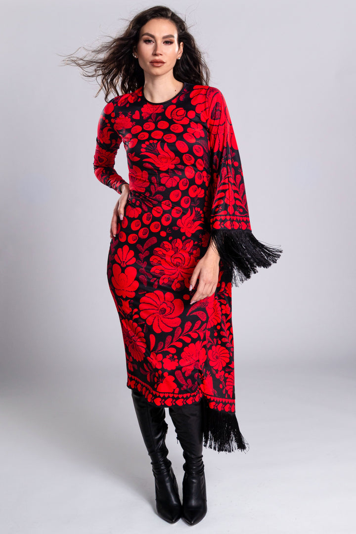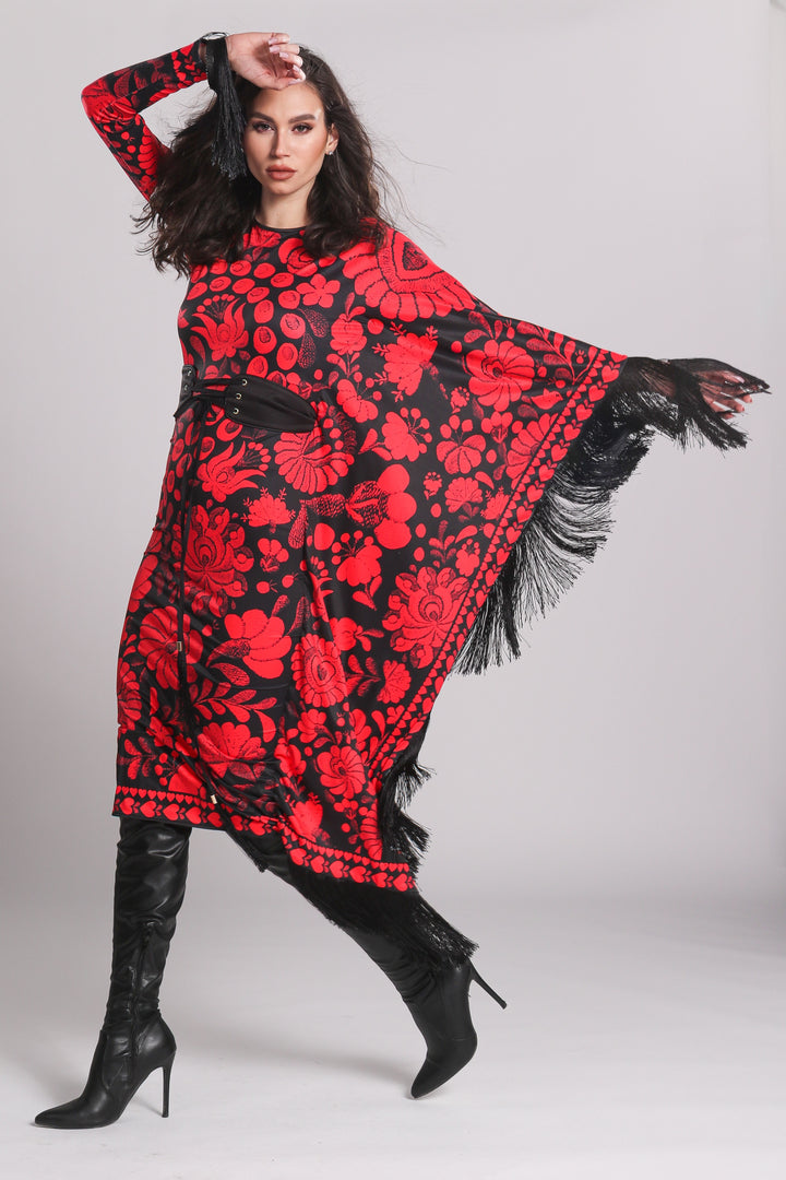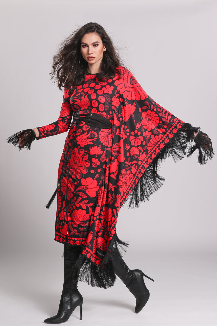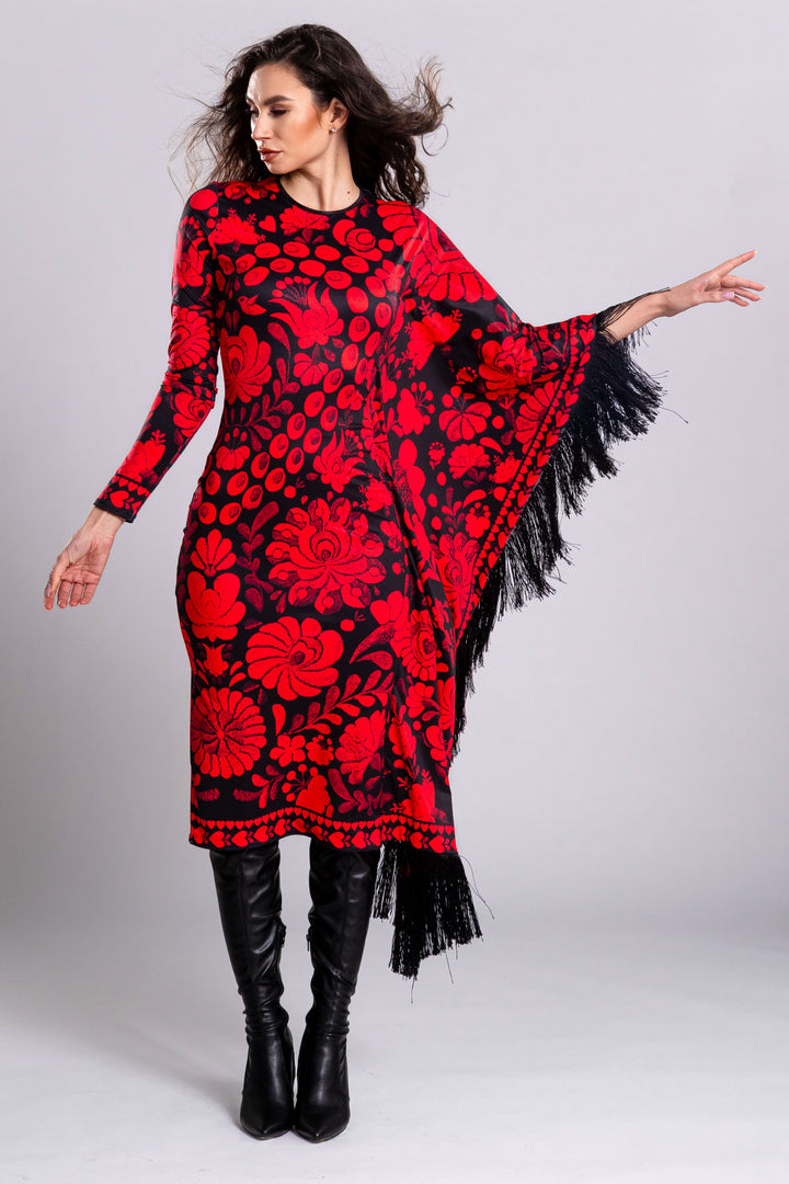 Long-sleeved, mid-calf-length, form-fitting, asymmetrical dress. The round, closed neckline is edged with a narrow strap. The edge of the left-hand veil is decorated with a wide, fringed accessory. To the front