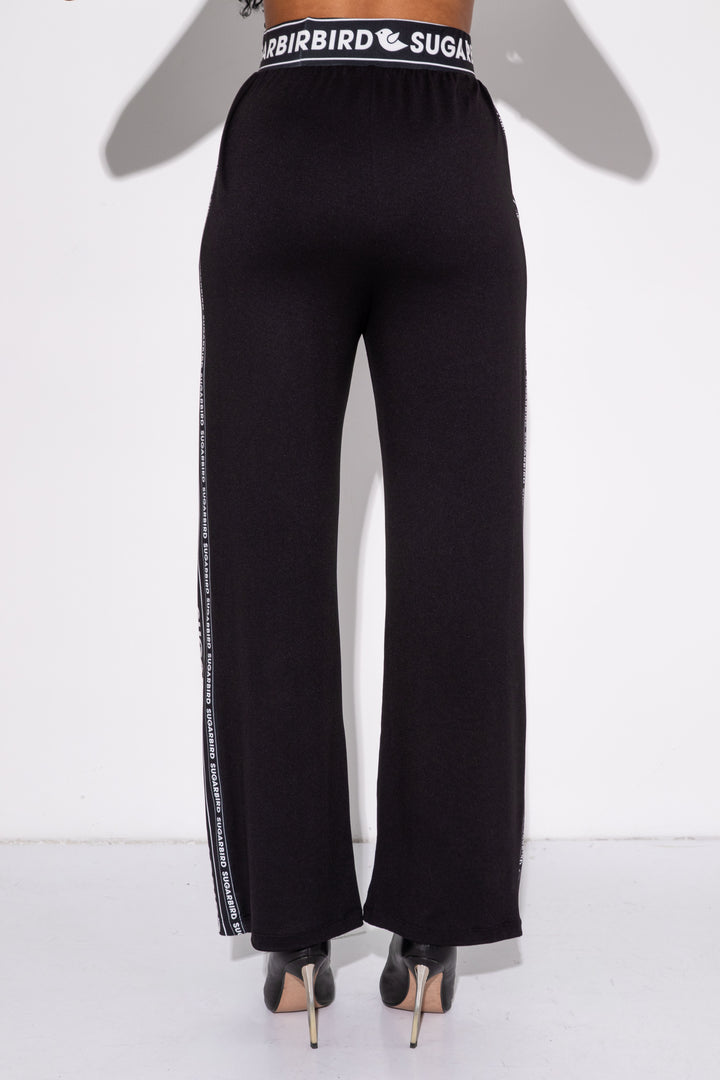 Long, straight-leg, high-waisted trousers. The waist is cinched with a folded waistband that is elasticated. The sides are decorated with a specially tailored, printed insert.