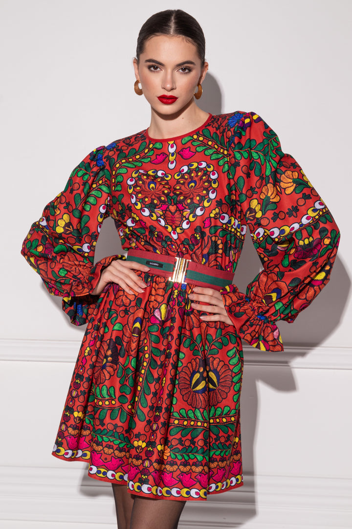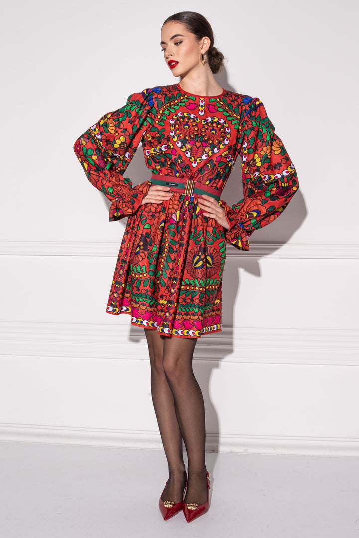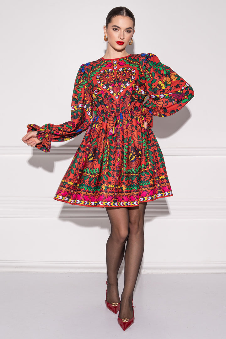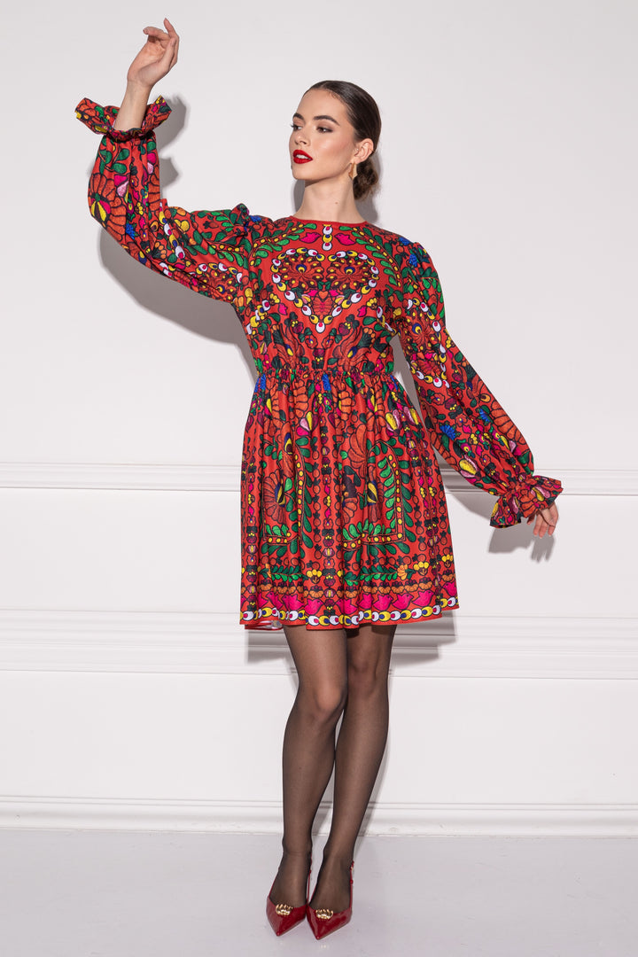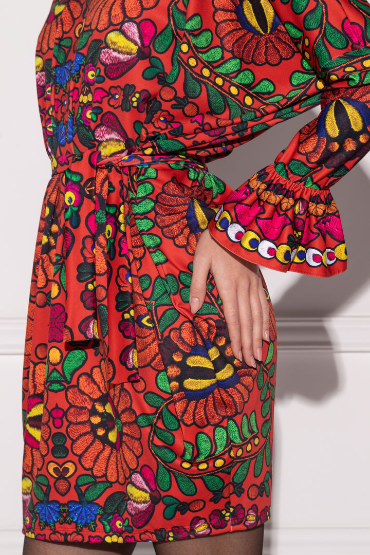 A loose-fitting dress with long, wide sleeves, above the knee length. The sleeves are elasticated at the wrists and waist, and the skirt is pulled. The bottom of the sleeves is decorated with a wide ruffle. The round, closed neckline is edged with a narrow strap, and it closes with a clasp above the slit at the back. On the back SUGARBIRD We sewed a label with the inscription.