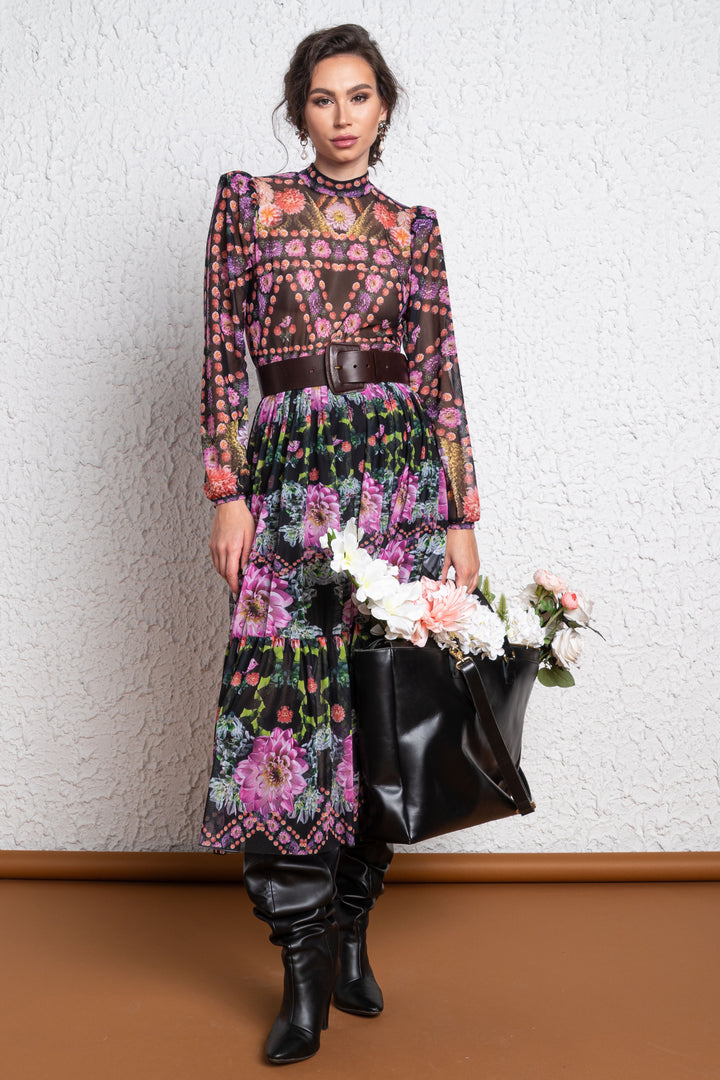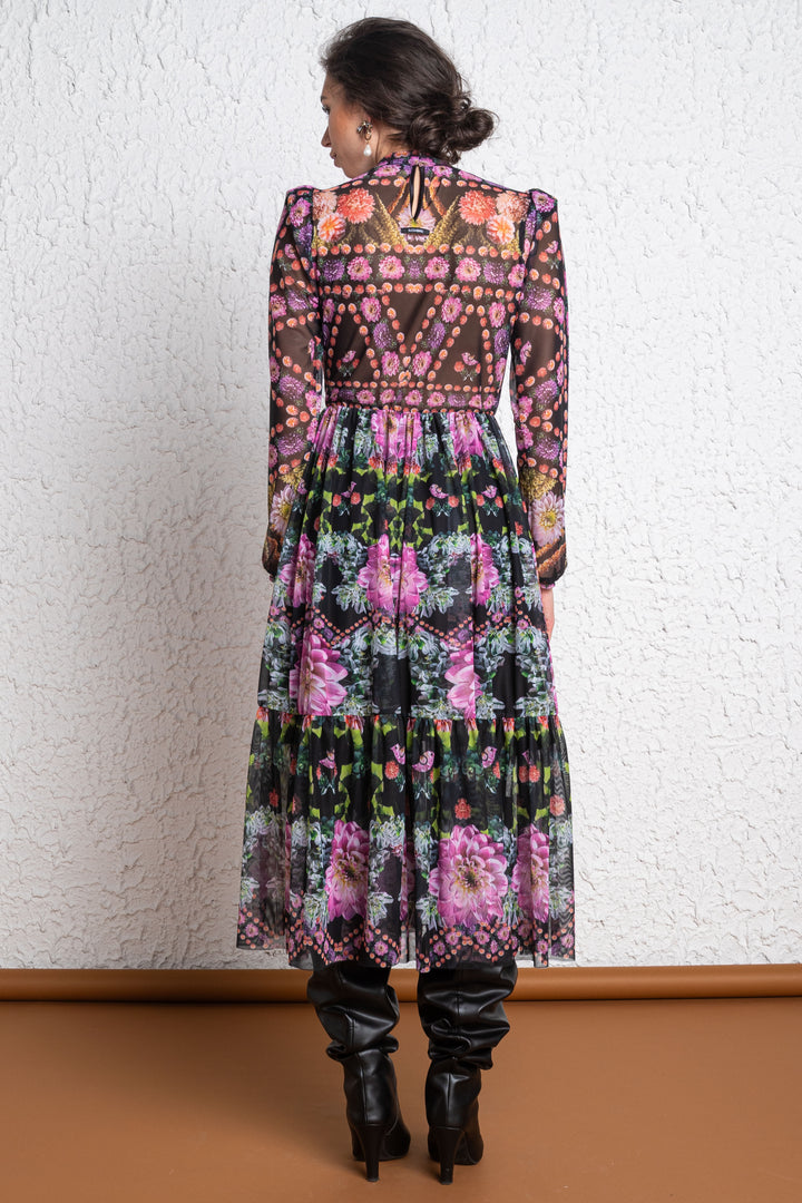 Long and puffy sleeves, maxi length, loose fit dress. The gathered skirt part is elasticated and lined. The neck is edged with a collar, which closes with buttons above a slit on the back. The bottom of the sleeves ends in elastic straps, the bottom of the skirt is decorated with wide and drawn ruffles. On the left sleeve SUGARBIRD We sewed a label with the inscription.