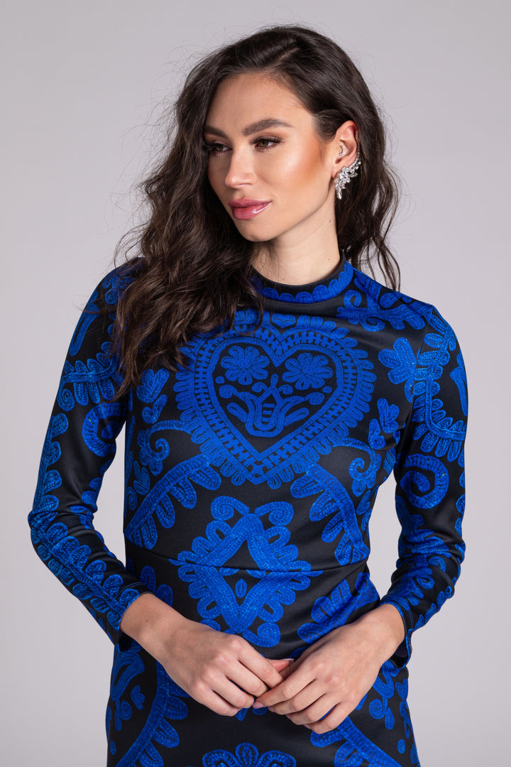 The pattern of our collection is decorated with graphics printed in blue on a black background, based on the Kalotaszeg written embroidery found in Transylvania.
