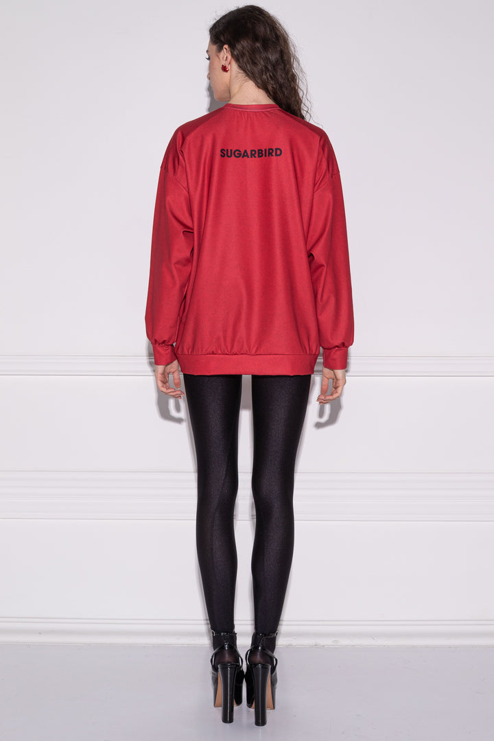 Long-sleeved, hip-length, loose-fitting sweater. Closed round neck, hem and cuffs are edged with folded straps. Front SUGARBIRD We sewed a label with the inscription.