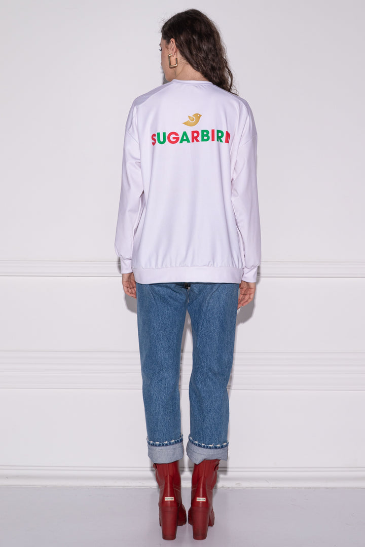 Long-sleeved, hip-length, loose-fitting sweater. Closed round neck, hem and cuffs are edged with folded straps. Front