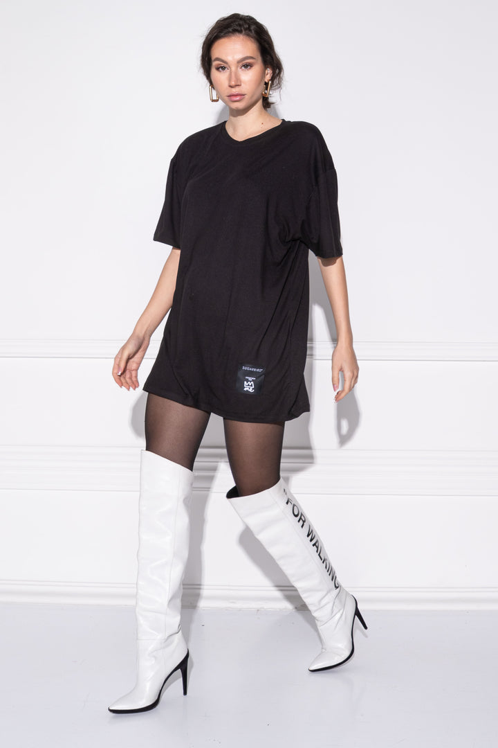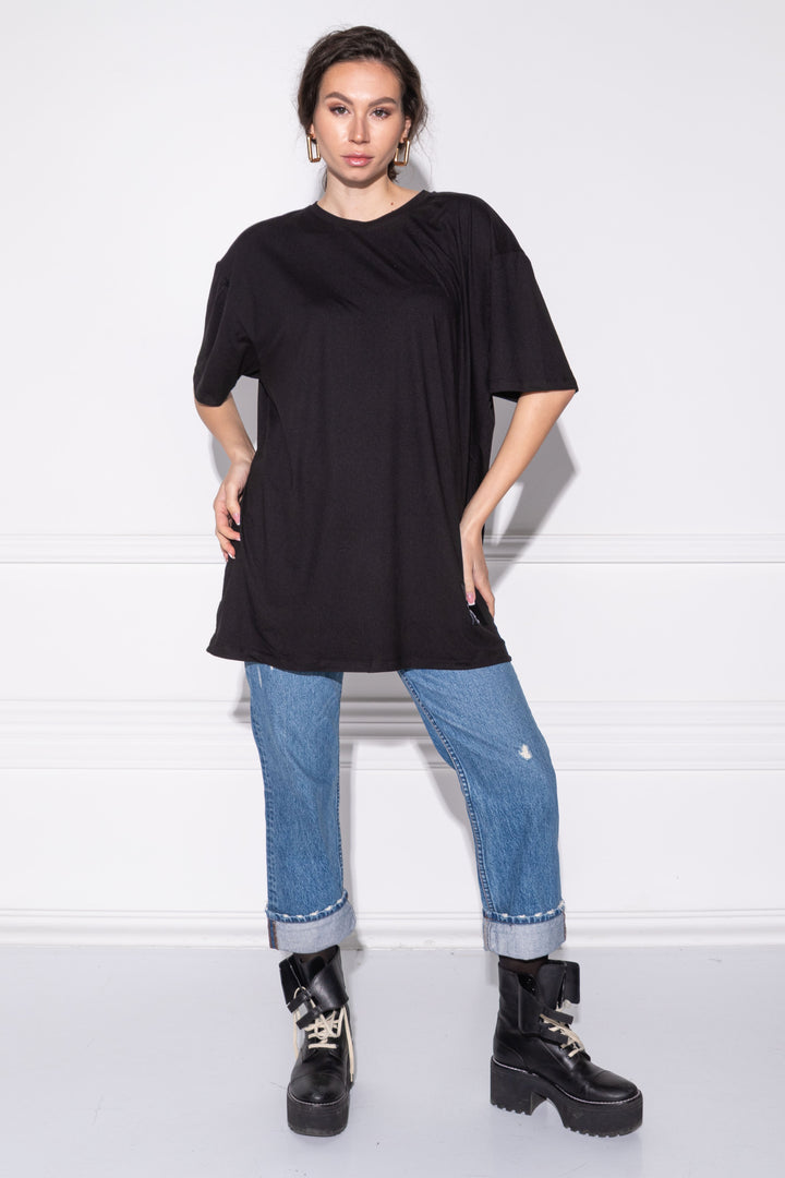 Short sleeves, loose, straight cut, mid-thigh length