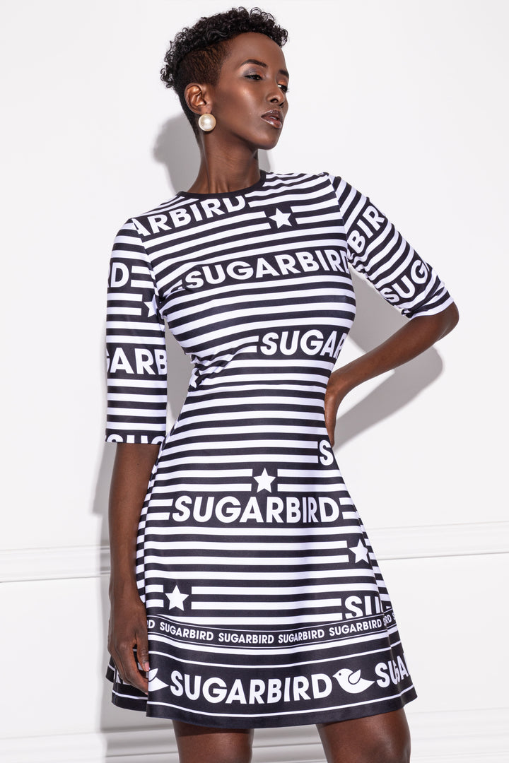 Three-quarter-length, form-fitting dress with knee-length sleeves. Form-fitting A-line at the top, flared at the skirt. Closed and round neckline, edged with a narrow strap. To your page