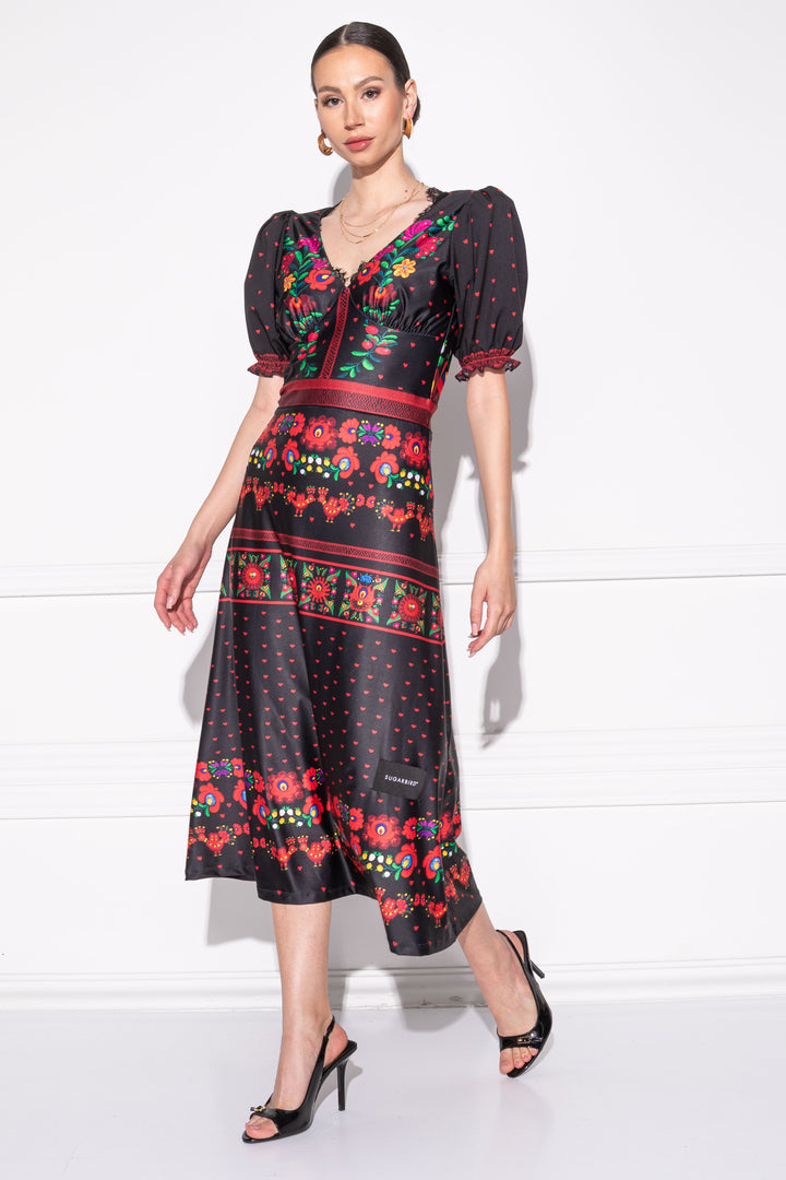 A form-fitting, lined dress with short, puffy sleeves and mid-calf length. The neckline is cut in a V shape, the bottom of the sleeves are elasticated. The skirt part is slightly A-line, the bust part is tailored and pulled. To the front SUGARBIRD We sewed a label with the inscription.