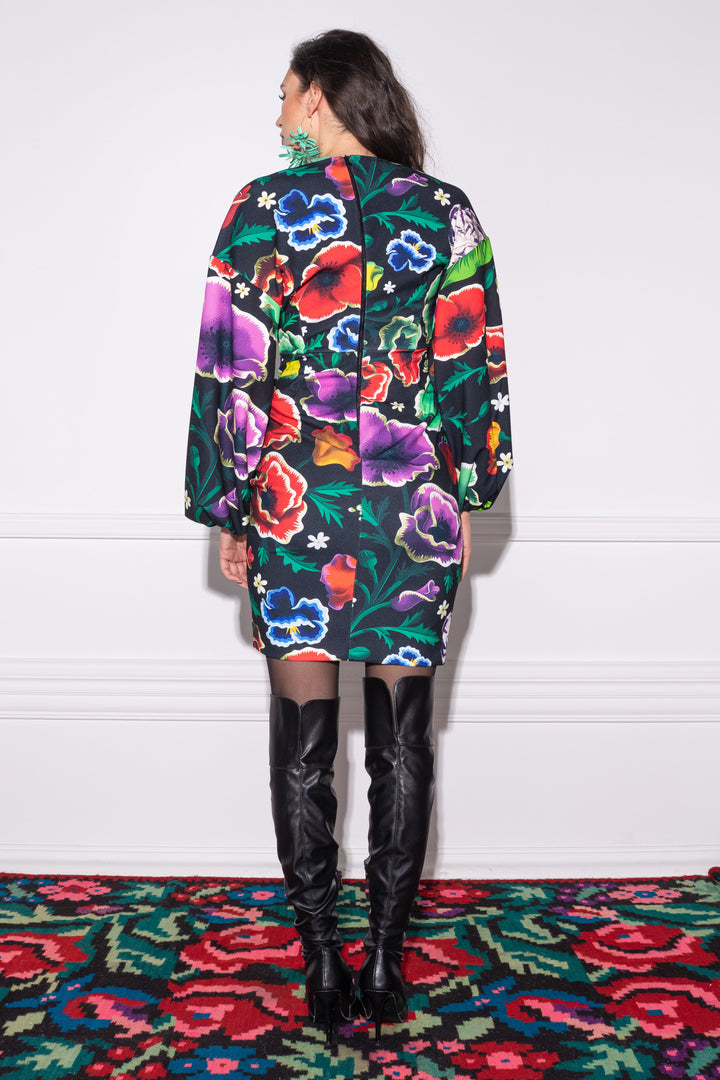 Mid-thigh length dress with long and puffy sleeves. V-neckline at the front and overlapping, with pleats under the bust and on the sleeves. Zip closure at the center back. Front