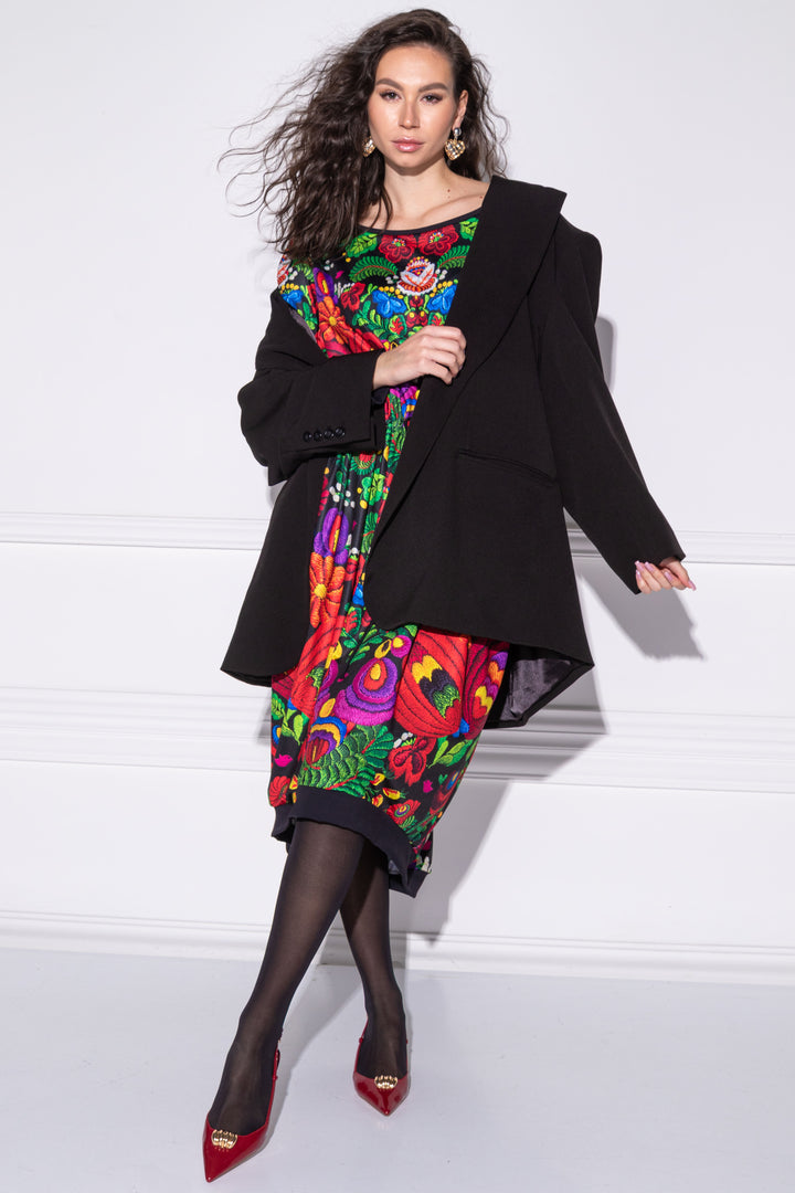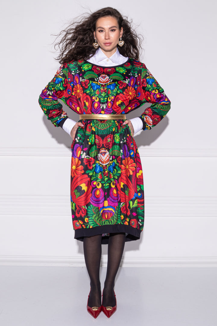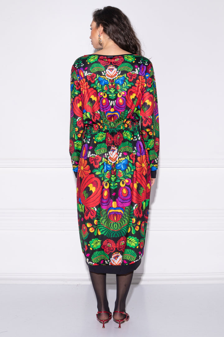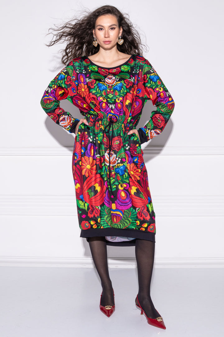 Long-sleeved, loose-fitting, mid-calf-length dress. Pockets are placed on the sides. The wide, round neck, bottom and bottom of the sleeves are edged with folded straps. The waist can be narrowed with a tie. On the back