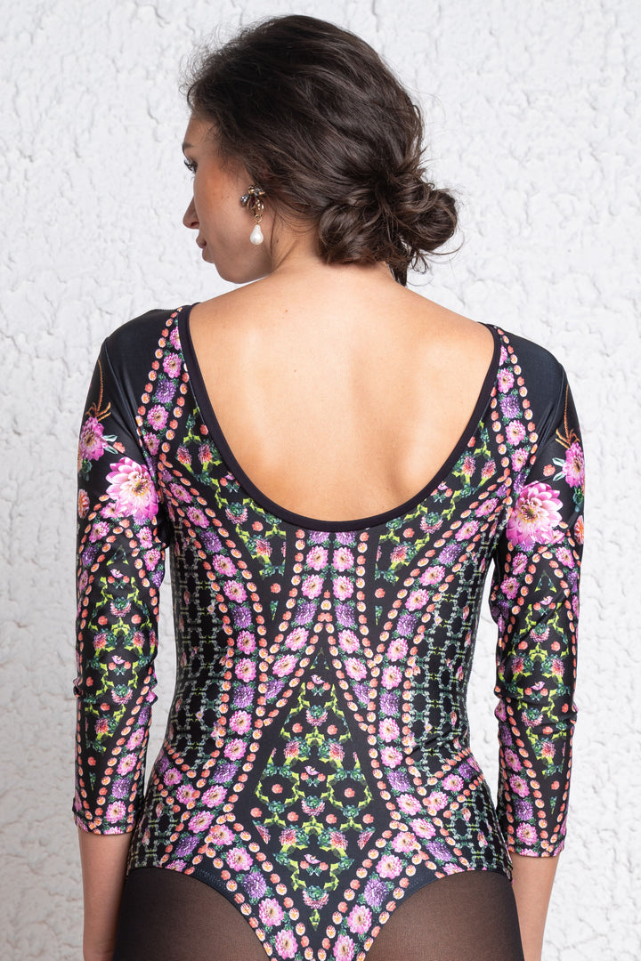Closed in front, with a deep curved neckline at the back, a figure-hugging, three-quarter-length sleeve bodysuit, the neckline of which is framed by a folded strap. It closes with a rubberized thigh section at the bottom and an adjustable clasp at the bottom. The back can be worn as the front if desired. On the left sleeve SUGARBIRD We sewed a label with the inscription.