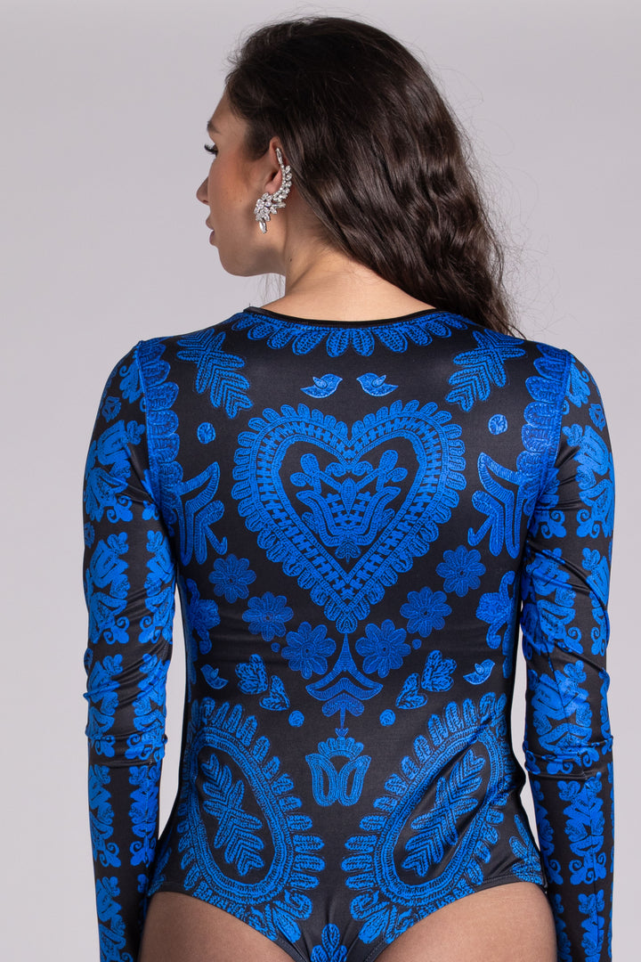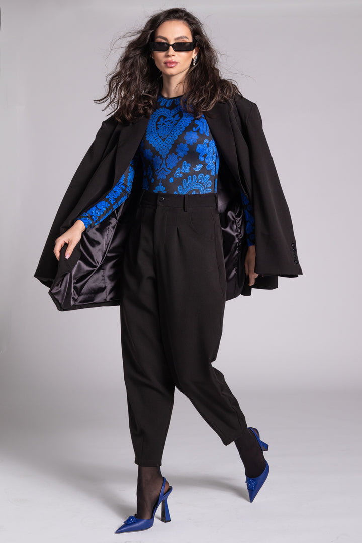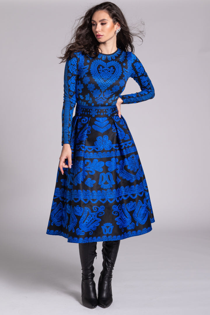 The pattern of our collection is decorated with graphics printed in blue on a black background, based on the Kalotaszeg written embroidery found in Transylvania.
