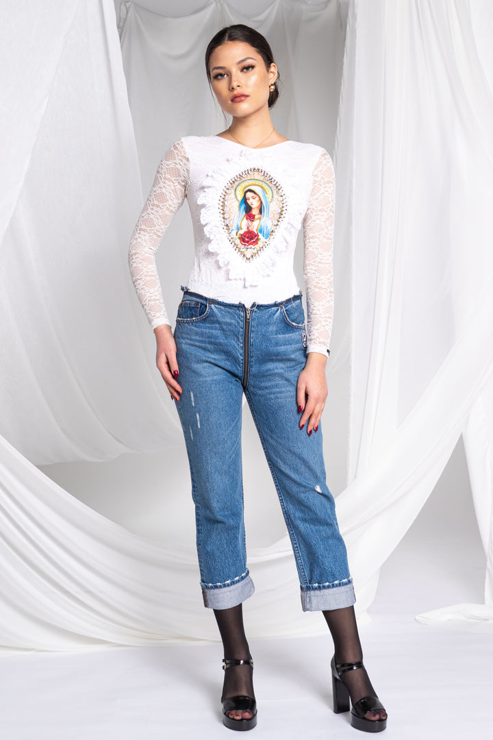 Discover the special pieces of our new Vive Maria collection, which feature the painted portrait of the Virgin Mary and its motifs as printed patterns.