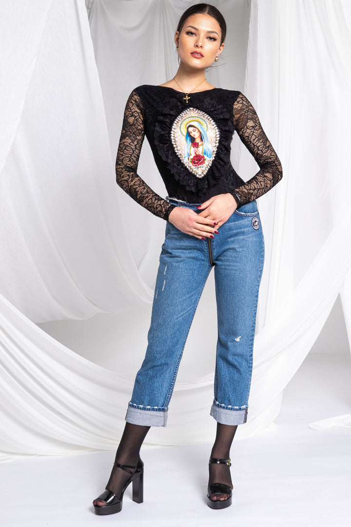 Discover the special pieces of our new Vive Maria collection, which feature the painted portrait of the Virgin Mary and its motifs as printed patterns.