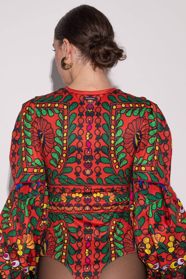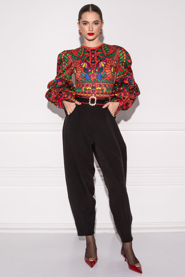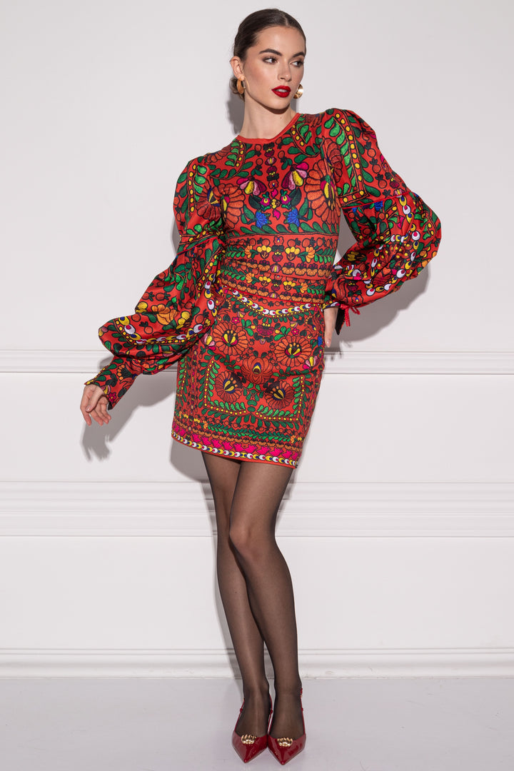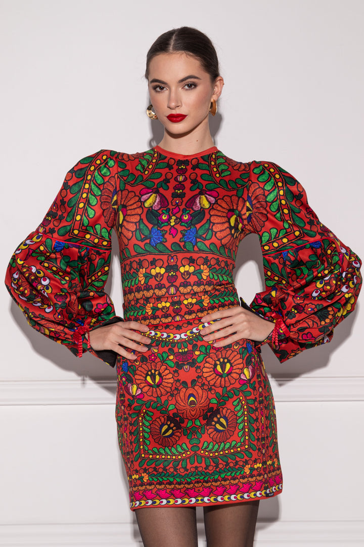 A loose-fitting dress with long, wide sleeves, above the knee length. The sleeves are elasticated at the wrists and waist, and the skirt is pulled. The bottom of the sleeves is decorated with a wide ruffle. The round, closed neckline is edged with a narrow strap, and it closes with a clasp above the slit at the back. On the back SUGARBIRD We sewed a label with the inscription.