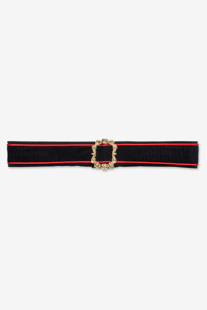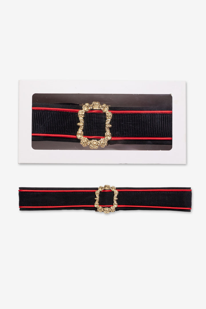 Széles gumis öv, amely fém övcsattal záródik. Szélein paszpól, elején díszes fém kellék, a csat mellett piros színű, SUGARBIRD feliratú címke díszíti. A termék stílusosan kialakított, díszdobozos csomagolásban érkezik, mely nemcsak esztétikus, hanem ízléses is.
