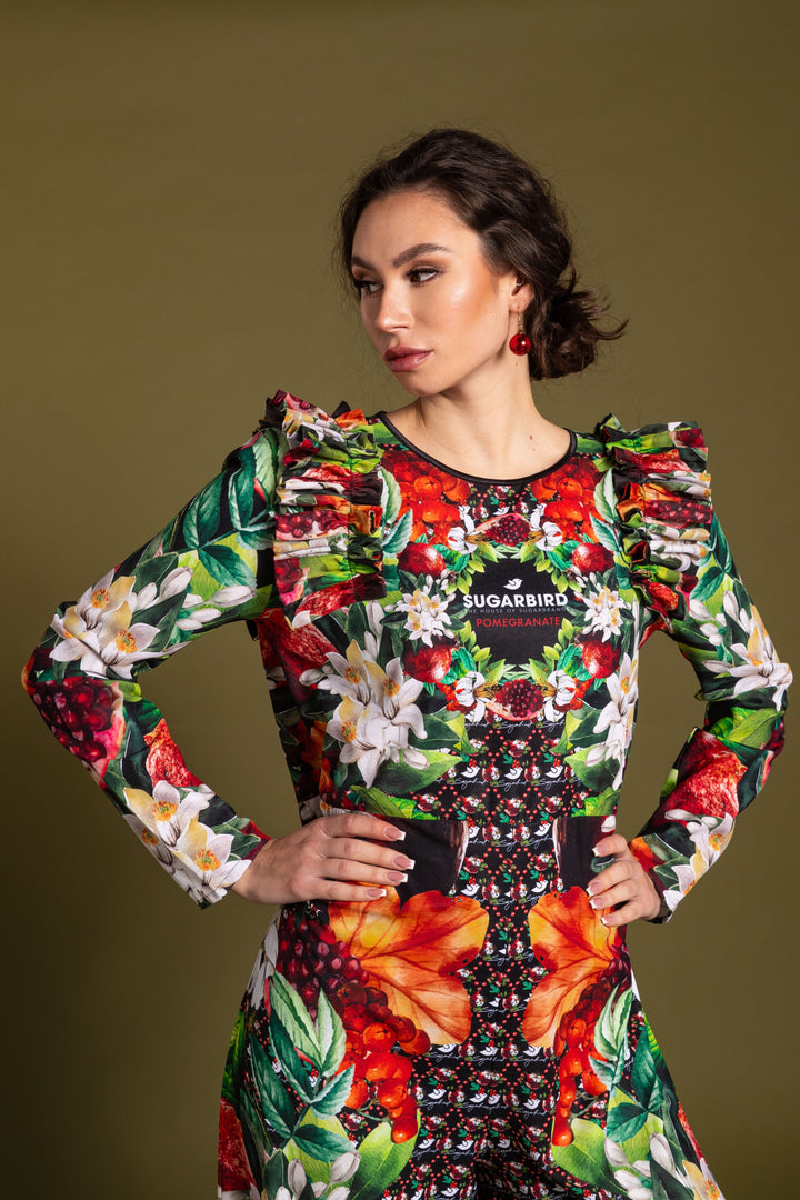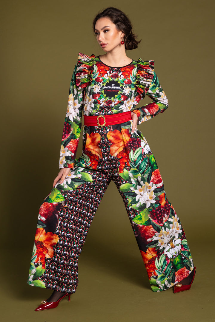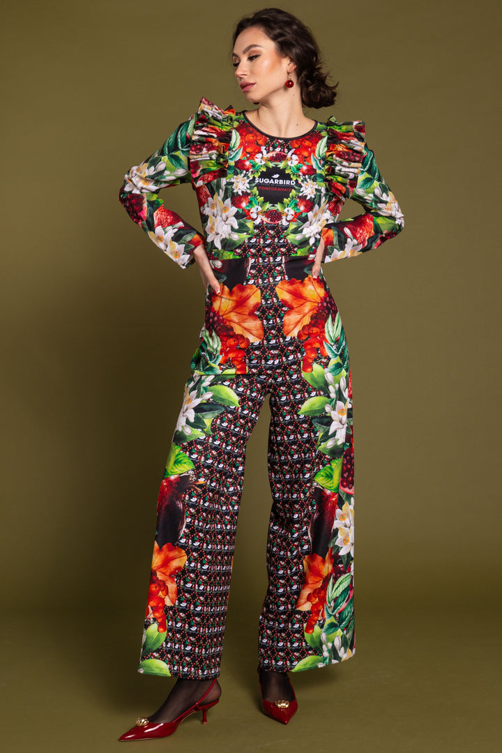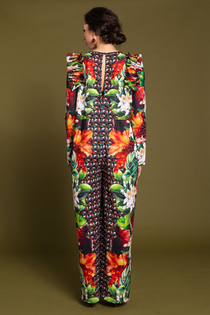 Long and wide legs, long sleeves, loose fit jumpsuitThe collar is edged with a narrow strap and closes with a clasp over a long slit on the back. It is decorated with wide and drawn ruffles on the shoulders. On the back SUGARBIRD We sewed a label with the inscription.